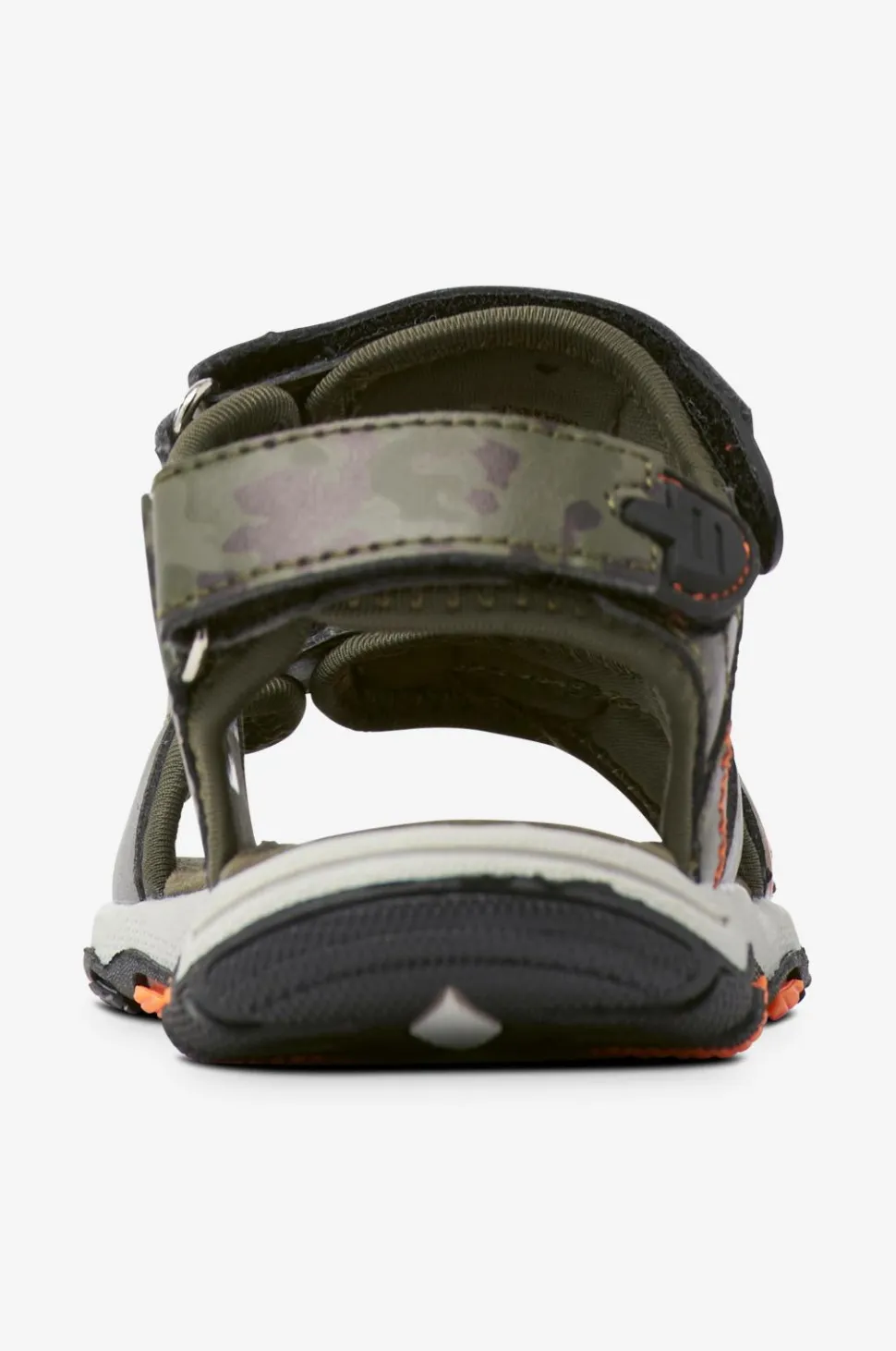 Sporty sandal fra Áhkká i camouflagemønstret imiteret skind med let vatterede remme med tekstilfor. De tre remme justeres med velcro for perfekt pasform. Stofbeklædt fodseng og ydersål med godt greb.