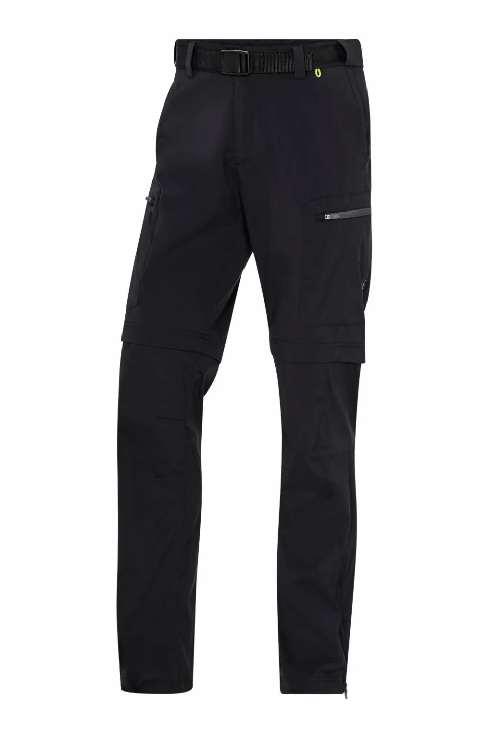 Linningen har et vævet stofbælte i stropper med spænde af plast, trykknap og gylp med lynlås. To forlommer. To benlommer foran og en baglomme, alle med lynlås. Benene kan lynes af ved knæene, så bukserne bliver til shorts. Løbegang med stop i benkant. Benkanten kan åbnes med lynlås. Indvendig benlængde ca. 83 cm i str. M.