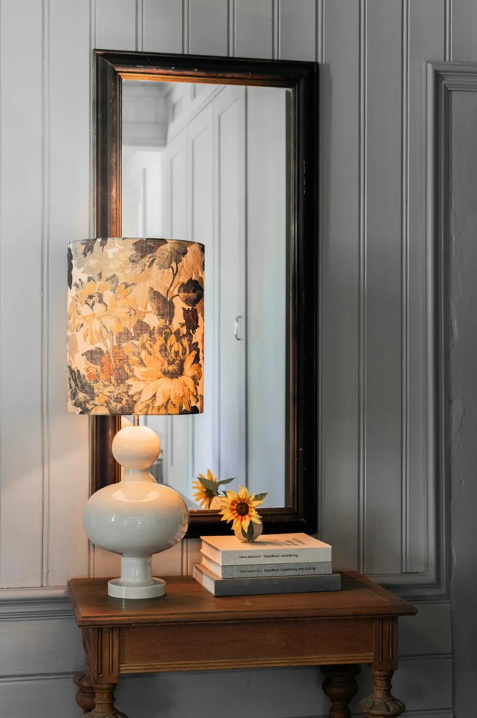 Cylinderformede lampeskærme passer ind i mange indretningsstilarter. De kan passe ind i både retro-stil og mere moderne indrettede rum. Vores cylinderformede lampeskærm er håndsyet i stoffet “sunflower”, et trykt stof med et smukt mønster i rige efterårsfarver. Kanterne er pænt foldet. De cylinderformede lampeskærme fås i to størrelser og flere farvekombinationer.