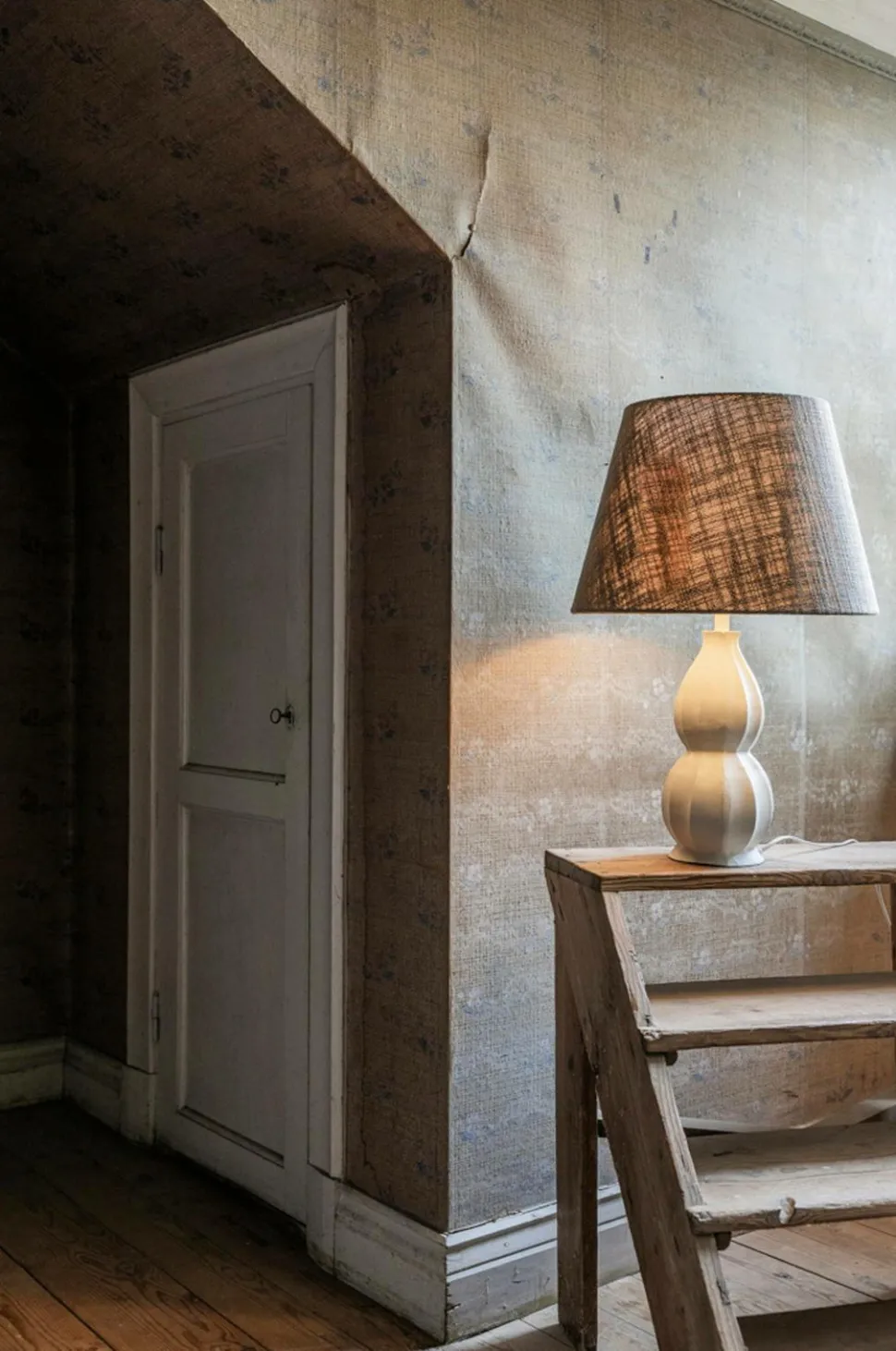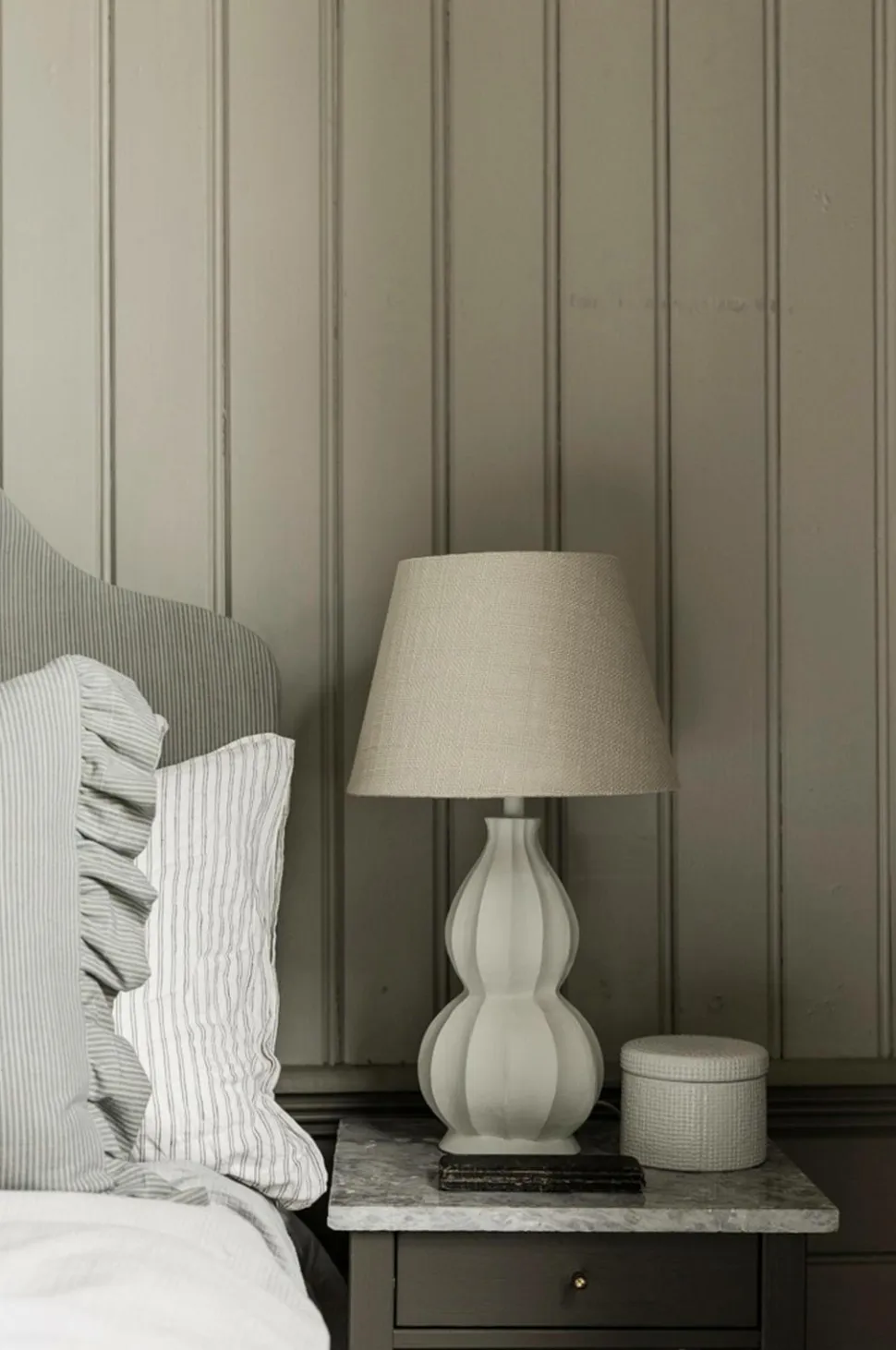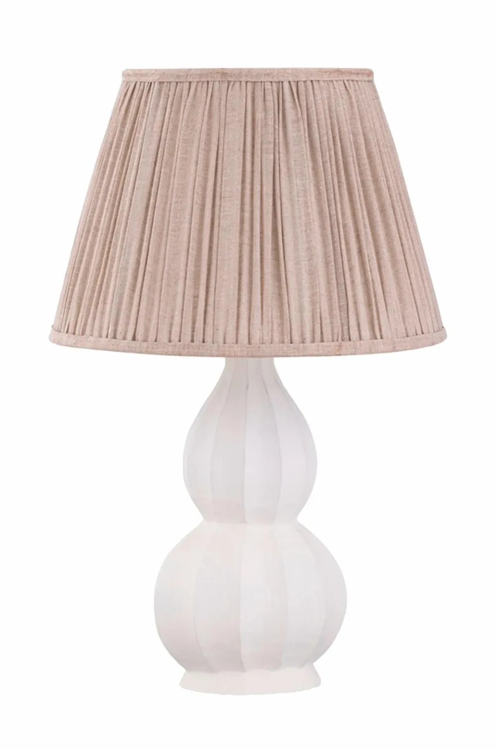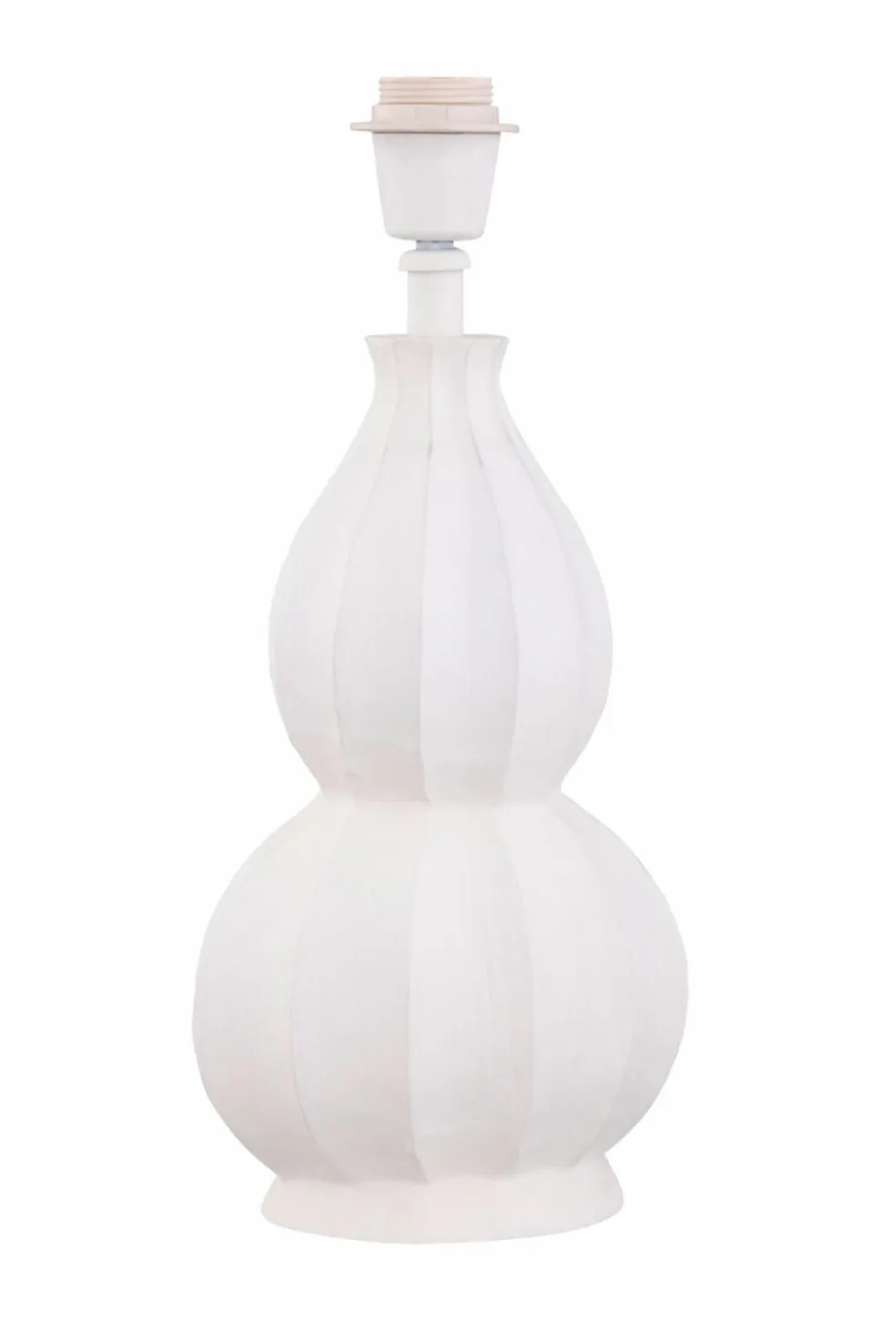 Lampesokkel med oval form. Overfladen har en lys stribe og finishen er mat hvid. Gusso er en lampesokkel, der er velegnet til at placere i et vindue eller på en skænk, da den ovale form ikke kræver meget dybde. Kombiner den gerne med en af vores ovale skærme.