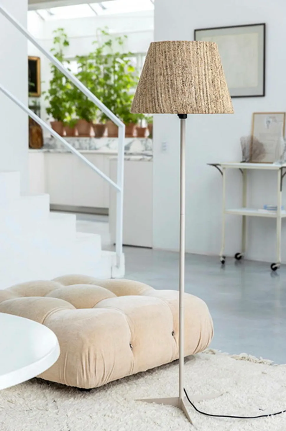 Lampeskærm lavet af groft stof, der giver et varmt og hyggeligt indtryk både med og uden lys. Vi bruger det samme stof på flere forskellige skærmstørrelser.