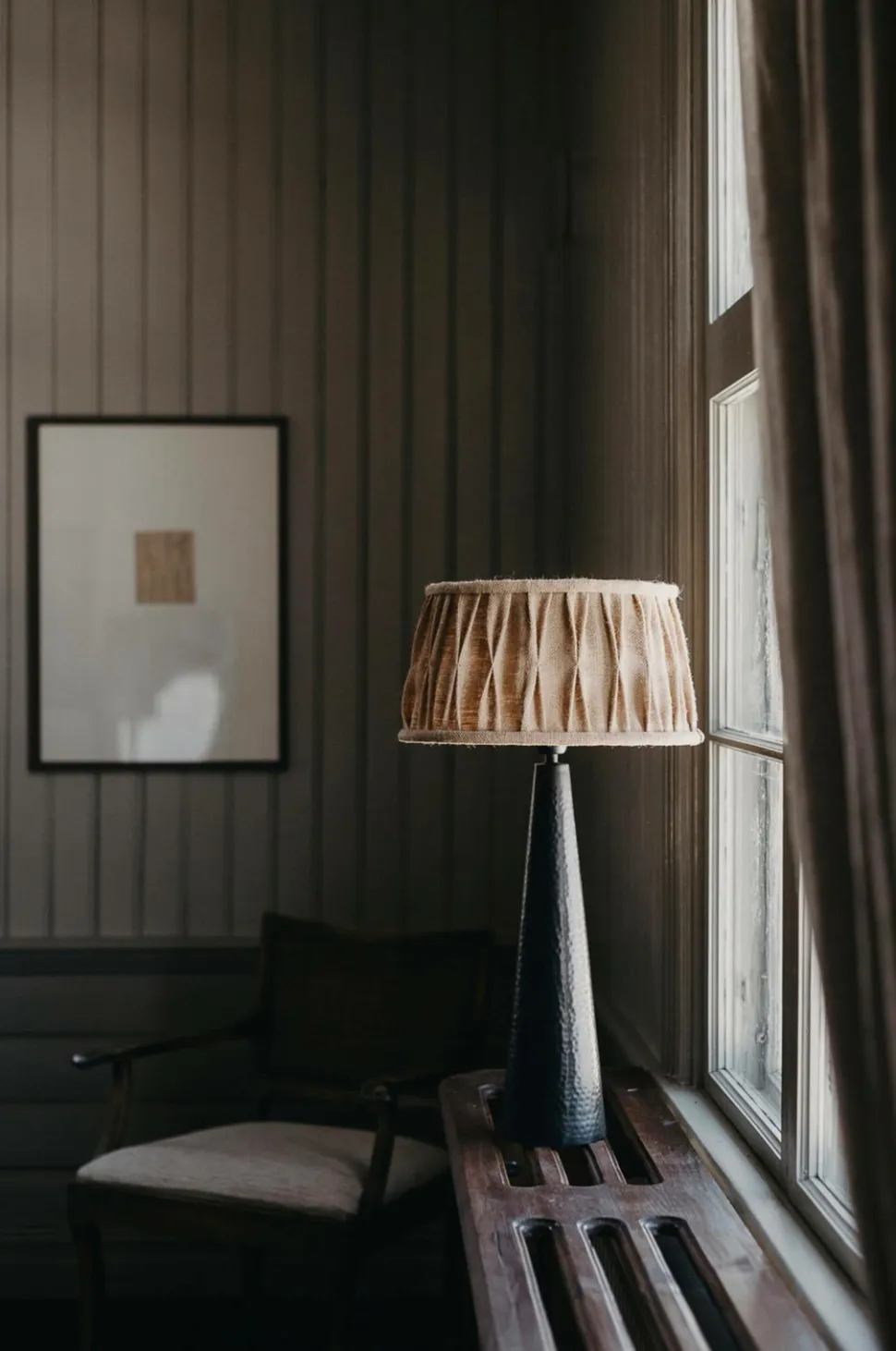 En klassisk syet skærm, der får et moderne udtryk med valget af ru jutestof. Har et låg, der forhindrer blænding fra lyskilden. Passer til flere af vores lampesokler.