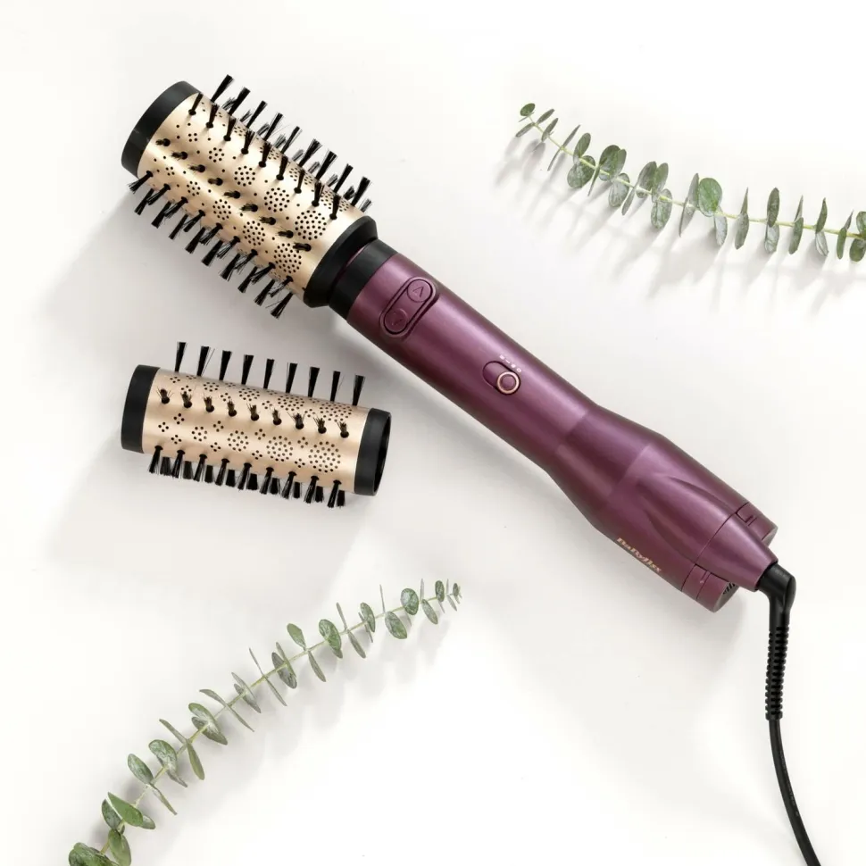 Varmluftbørsten har to udskiftelige børstehoveder i forskellige størrelser, som passer til alle hårlængder.