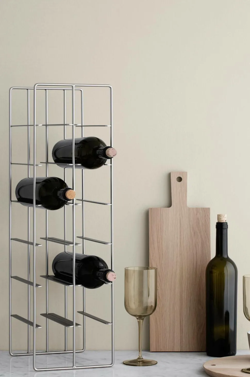 Vinreol fra Blomus. PILARE vinreol har plads til 12 flasker og bliver med sit stilrene design en flot del af indretningen. Mål: H 66 cm, B 19 cm, T 22 cm, Materiale: Mat nikkelpletteret stål