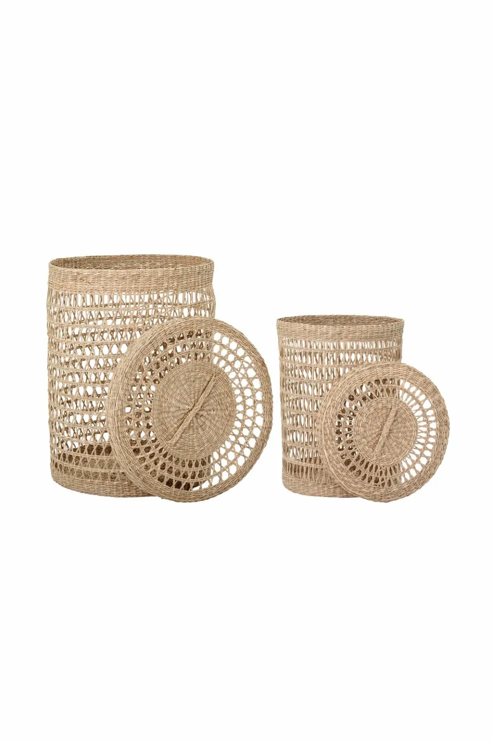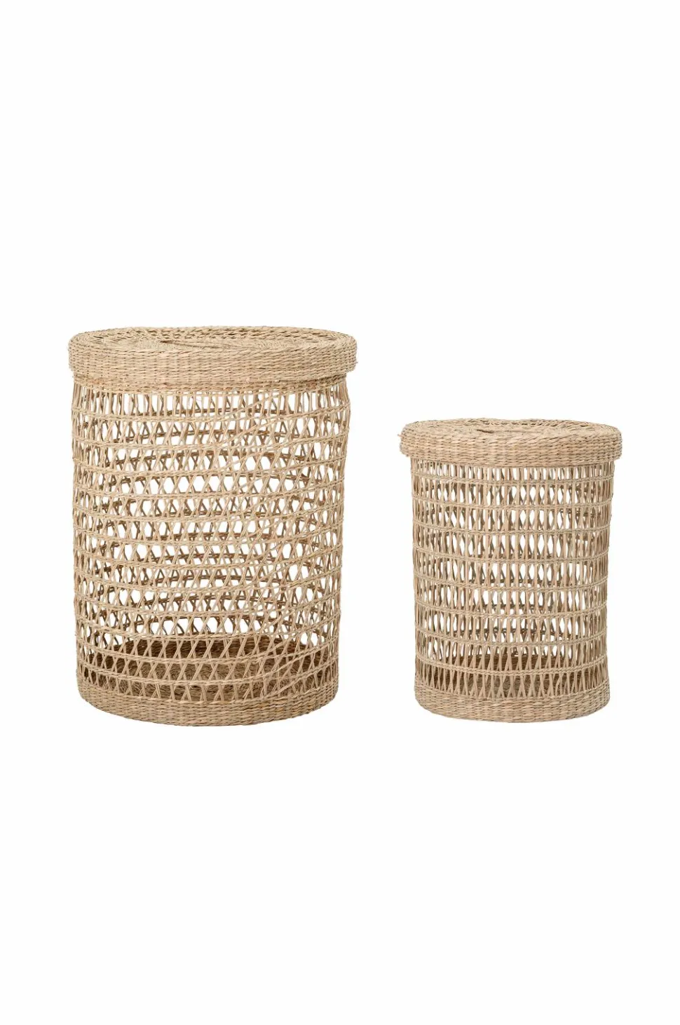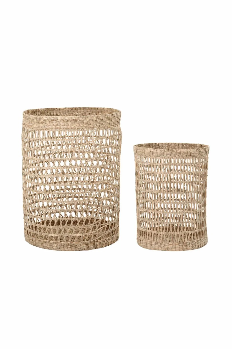 Sæt med to kurve af søgræs til opbevaring af vasketøj, tæpper, toiletpapir – du bestemmer. Mål; Lille kurv højde 40, diameter 31 cm. Stor kurv højde 53, diameter 41 cm.