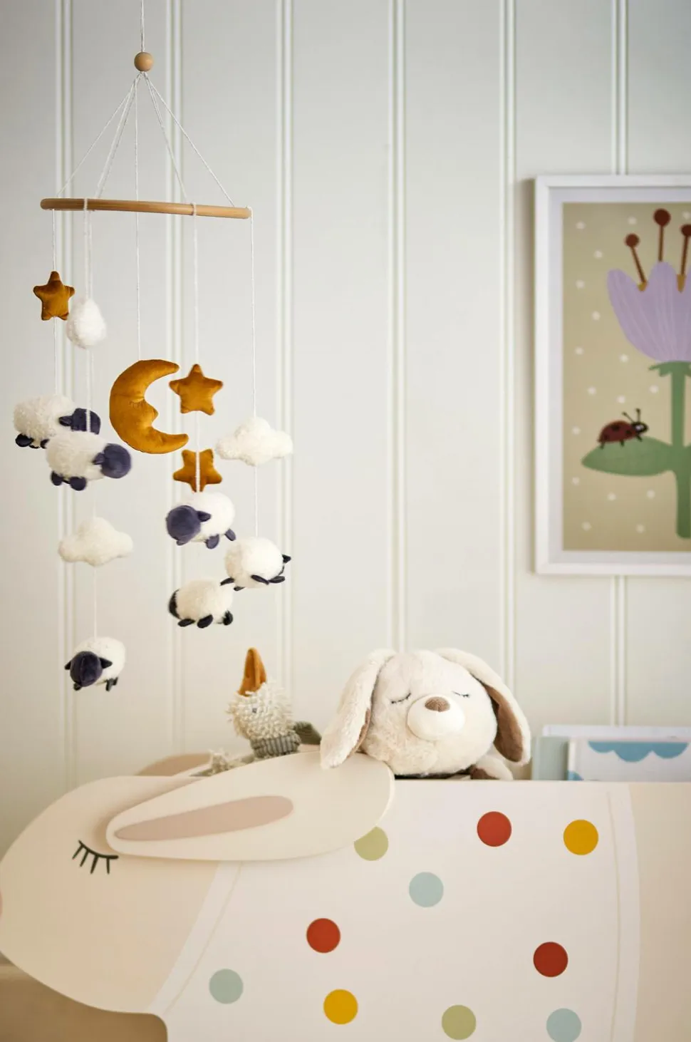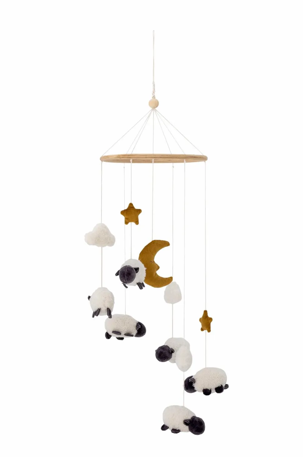 Dolly-uroen fra bloomingville mini har små får lavet af blødt polyester. Den hænger smukt og giver børneværelset et legende præg – ideel over puslebordet eller tremmesengen.