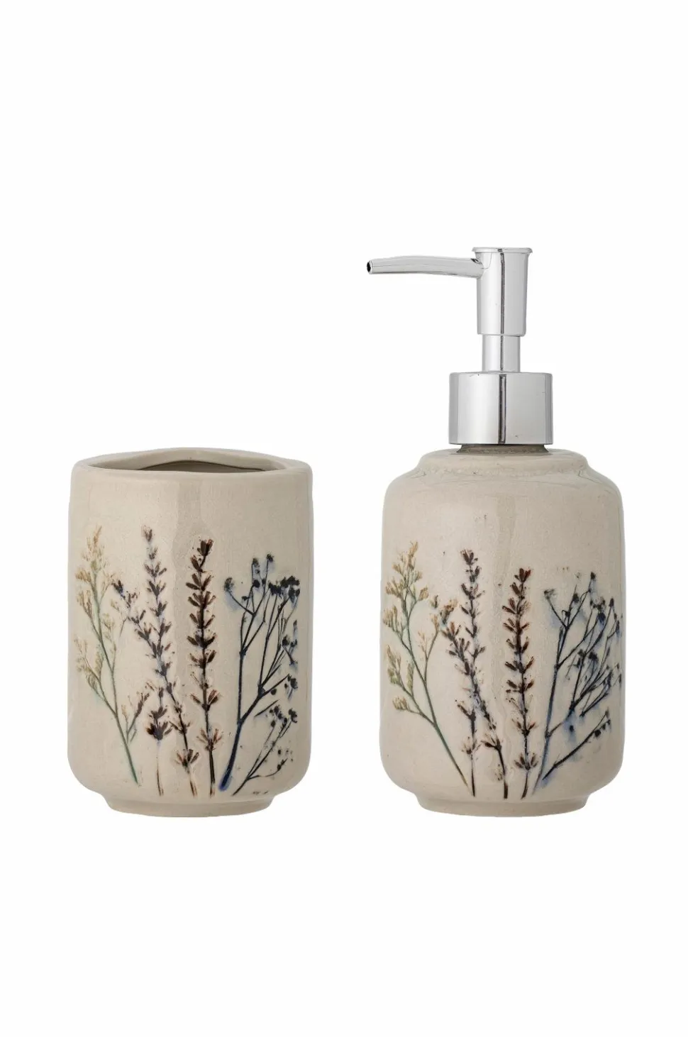 Bea sæbepumpe og krus fra Bloomingville er en del af den smukke kollektion Bea. Sæt af stentøj i naturfarve med smukt blomstermotiv på den krakelerede glasur. Perfekt i badeværelset med sæbe og tandbørster eller i køkkenet med opvaskemiddel og en opvaskebørste. Produkterne varierer og er unikke på grund af materialet og det håndlavede design. Sælges i sæt med 2, mål sæbepumpe, diameter 8, højde 18 cm. Mål krus diameter 8, højde 11 cm.