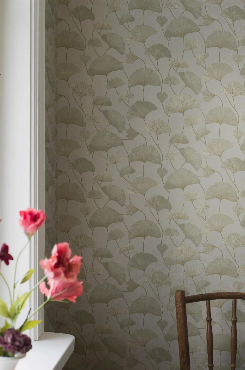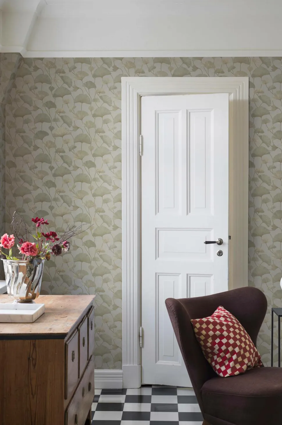 Vores tapet sophia giver rummet en beroligende stemning. Det har et ginkgoblad, der vokser opad i en organisk bevægelse over en smukt bølgende baggrund. Hæng sophia tapet i din stue, gang eller soveværelse for at få et roligt og friskt rum. Hver rulle er 10,05 m. Med 53 cm. Mønstergentagelse på 26,5 cm, lige match. Fremstillet i Sverige på et ikke-vævet materiale. Tapetet er easyup-marked, hvilket betyder, at du påfører limen direkte på væggen og ikke behøver at male på underlaget først.