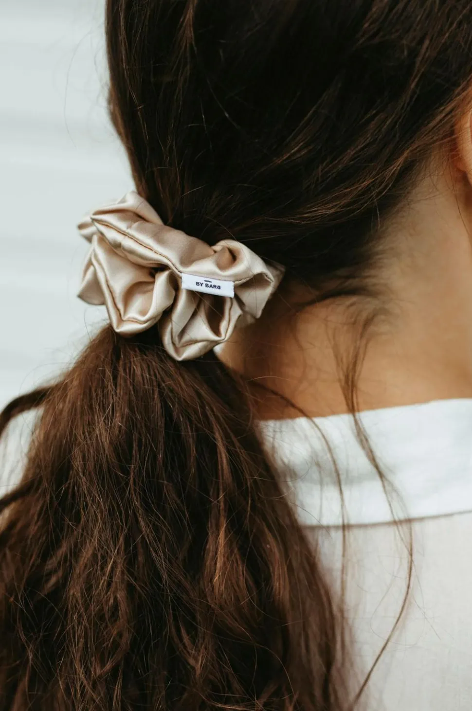 Stor plejende silkeelastik i scrunchiemodel. Med silke i håret reduceres risikoen for slitage og knækkede hårstrå. Silke reducerer også mærker og til et smukt og velplejet hår. Stofbredde: 3 cm. Materiale: morbærsilke.