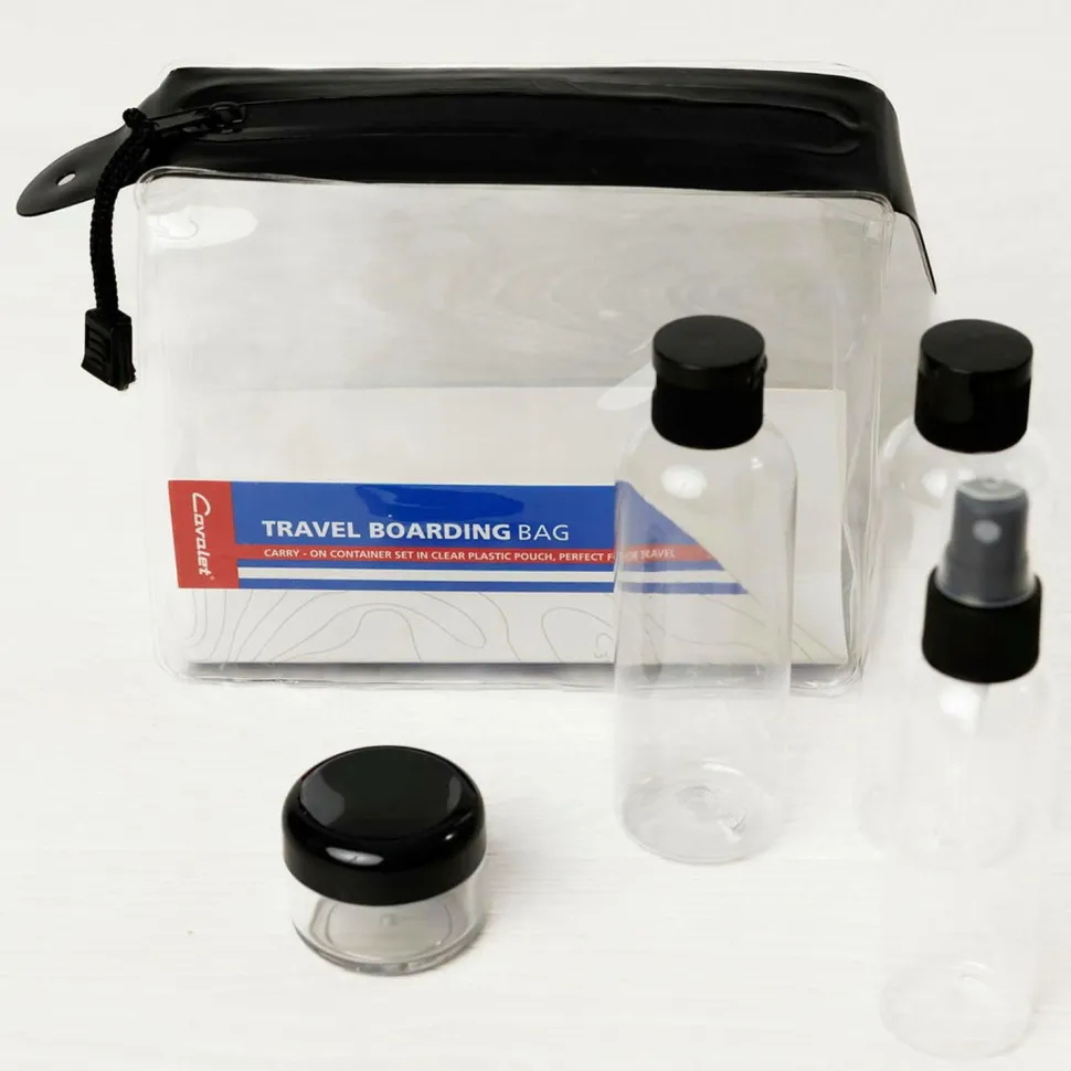 • PET-rejseflaskesæt i lynlåspose (to 100 ml-flasker, en 60 ml-pumpeflaske, en 25 ml-krukke)