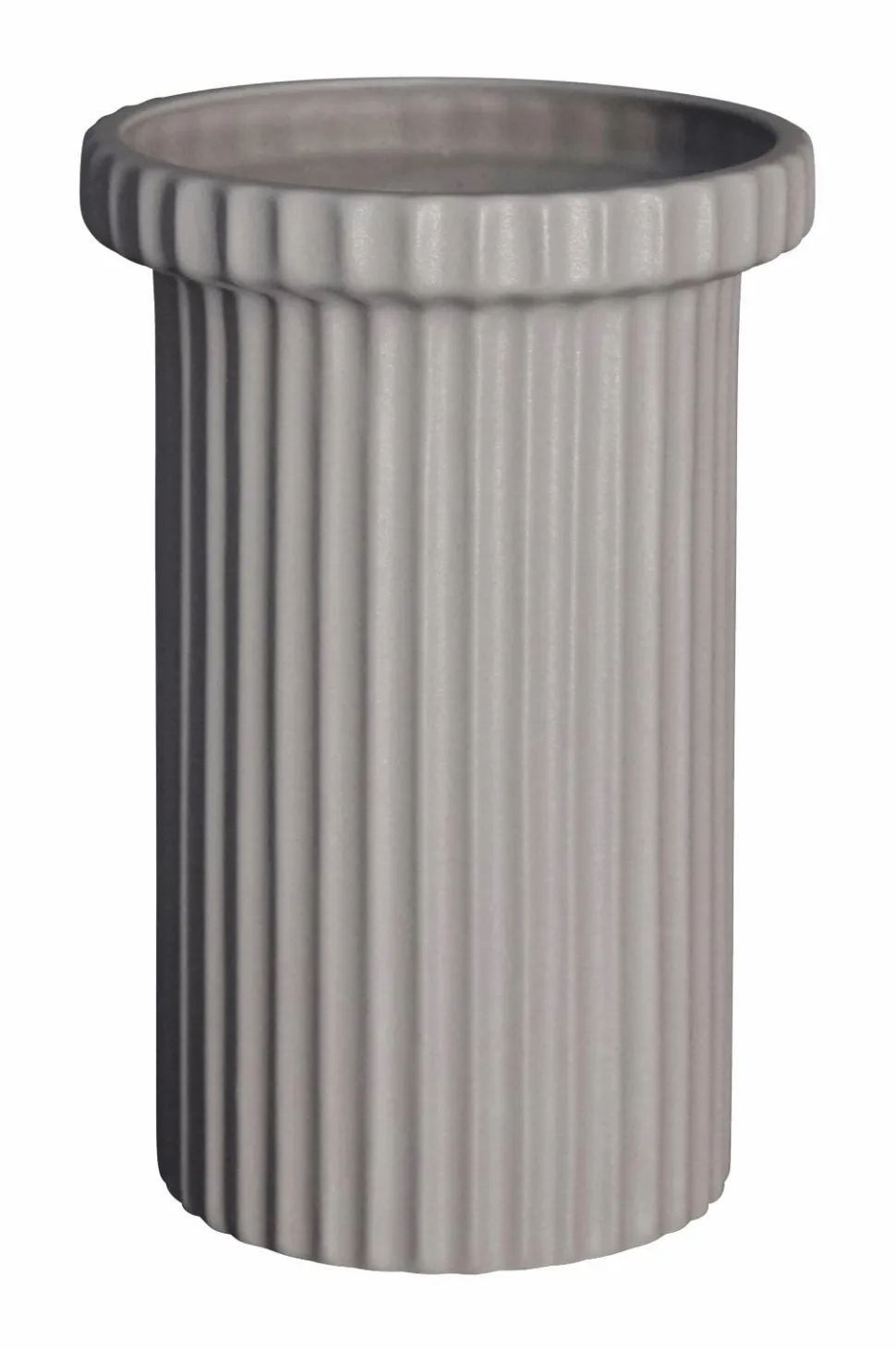 Krukke i keramik med stribet overflade. Diameter 12 cm, højde 22 cm.