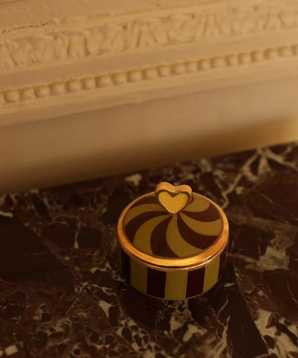 Tilføj et legesygt, men elegant touch til dit hjem med Pyar Heart Circus Box Medium Yellow. Denne mellemstore dekorative opbevaringsboks er håndlavet af 60 % messing og 40 % harpiks, hvilket gør den både smuk og bæredygtig. Den runde form, de markante striber i gul og bordeaux og det yndige hjerteformede håndtag på toppen giver den et unikt og muntert udseende. Med sine kompakte dimensioner på 6 x 7 x 7 cm er denne hjerteformede cirkusæske ideel til opbevaring af dine ringe, øreringe, armbånd eller andre små skatte. Uanset om den placeres på et toiletbord, natbord eller en hylde, fungerer den både som smykkeskrin og en iøjnefaldende dekoration. Leder du efter en særlig måde at organisere dine daglige fornødenheder på? Pyar Heart Circus Box er perfekt til opbevaring af minder, småpenge, hårspænder eller nøgler. Det hængslede låg med det hjerteformede håndtag er let at løfte og tilføjer en sød detalje, der gør stykket virkelig personligt. Denne gule hjerteæske er en vidunderlig gave til en ven, en elsket eller dig selv. Perfekt til fødselsdage, jubilæer eller som en munter tak. Kombiner den med en lille seddel eller en overraskelse indeni for en charmerende præsentation.