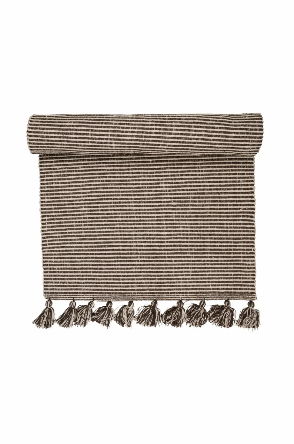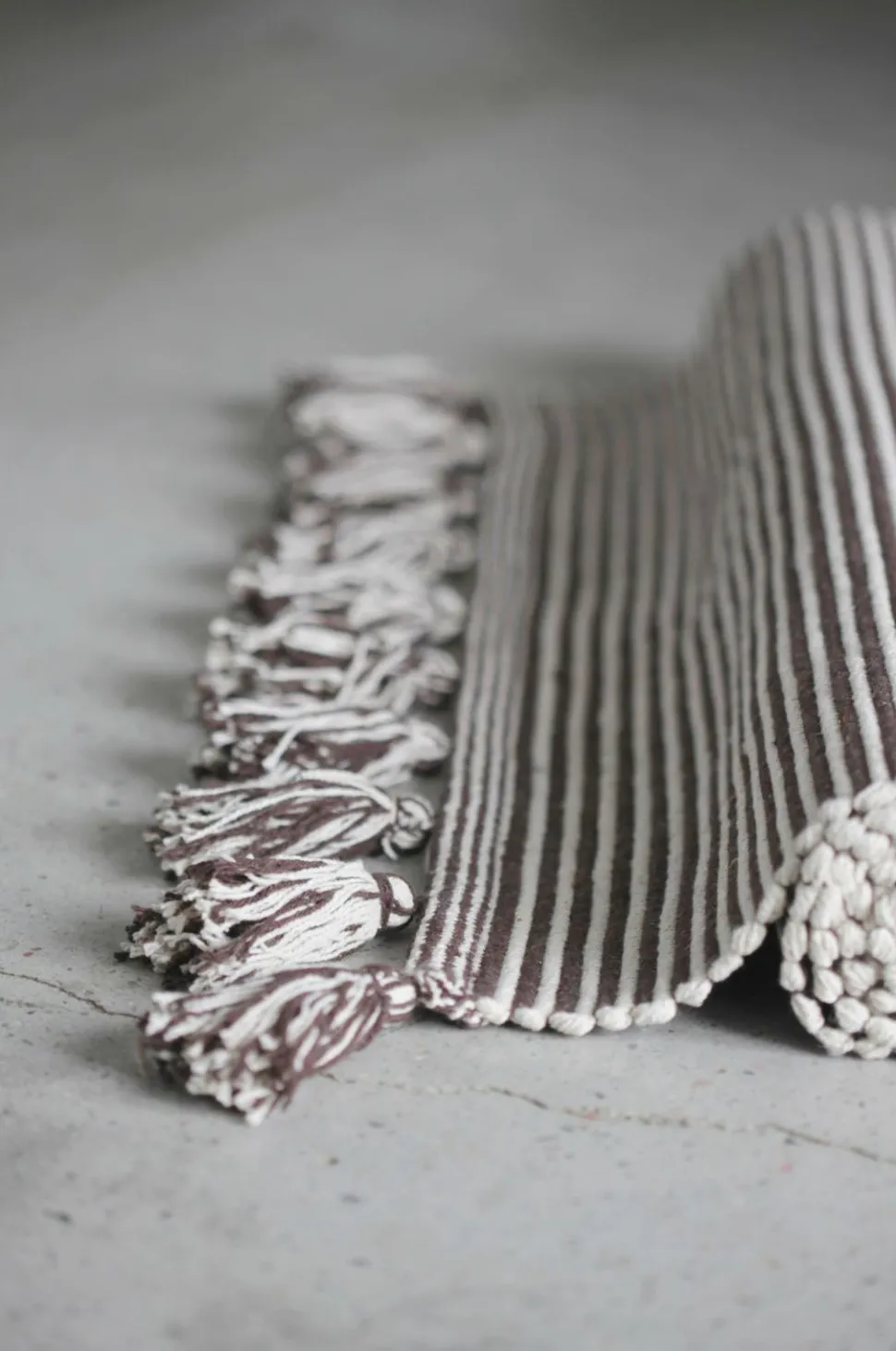 Gulvtæppe i 100% bomuld med kvaster på de korte sider. Kemisk rens.