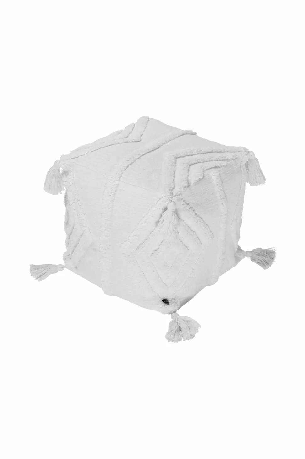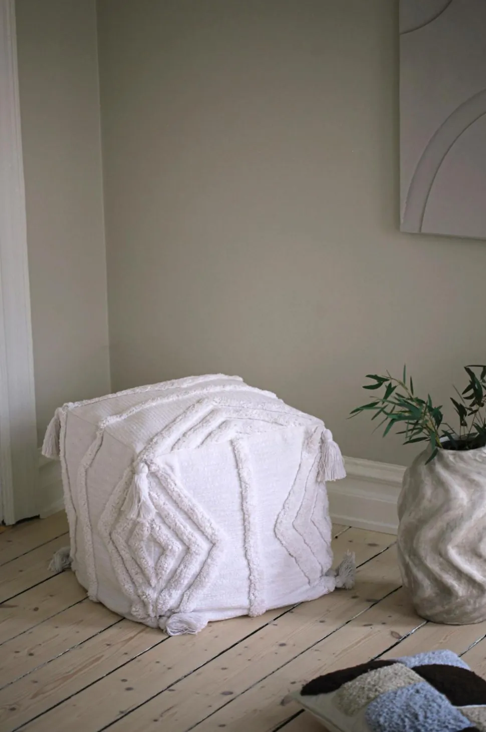 Siddepuf med tuftede detaljer og dekorative kvaste i hjørnerne. Polybean-fyld med aftageligt betræk i 100% bomuld. Håndvaskes.
