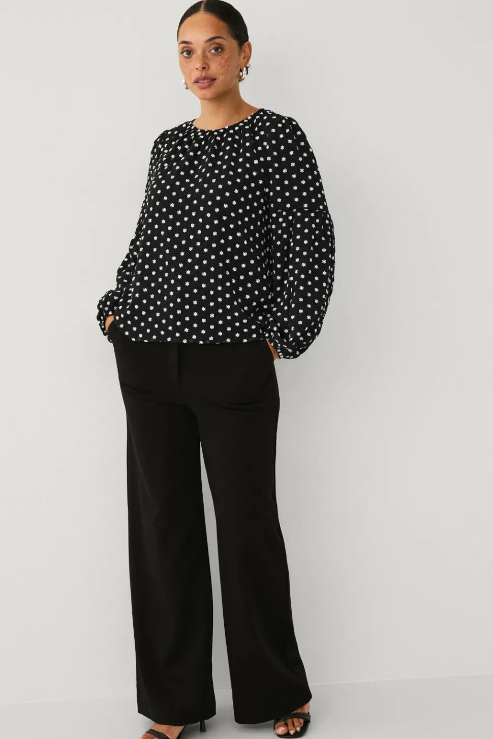 • Langt ballonærme med elastik ved manchetterne og dekorativ søm med en bølgeformet effekt
