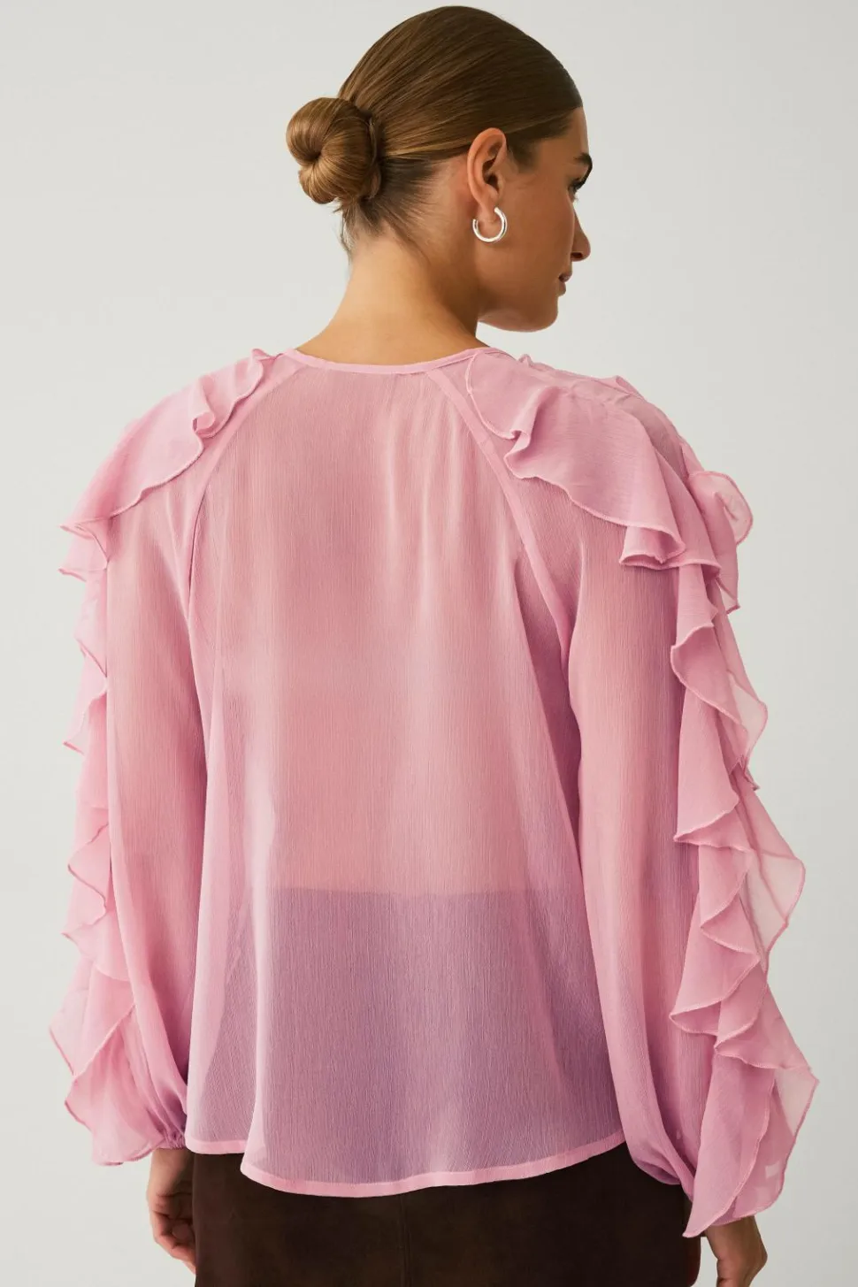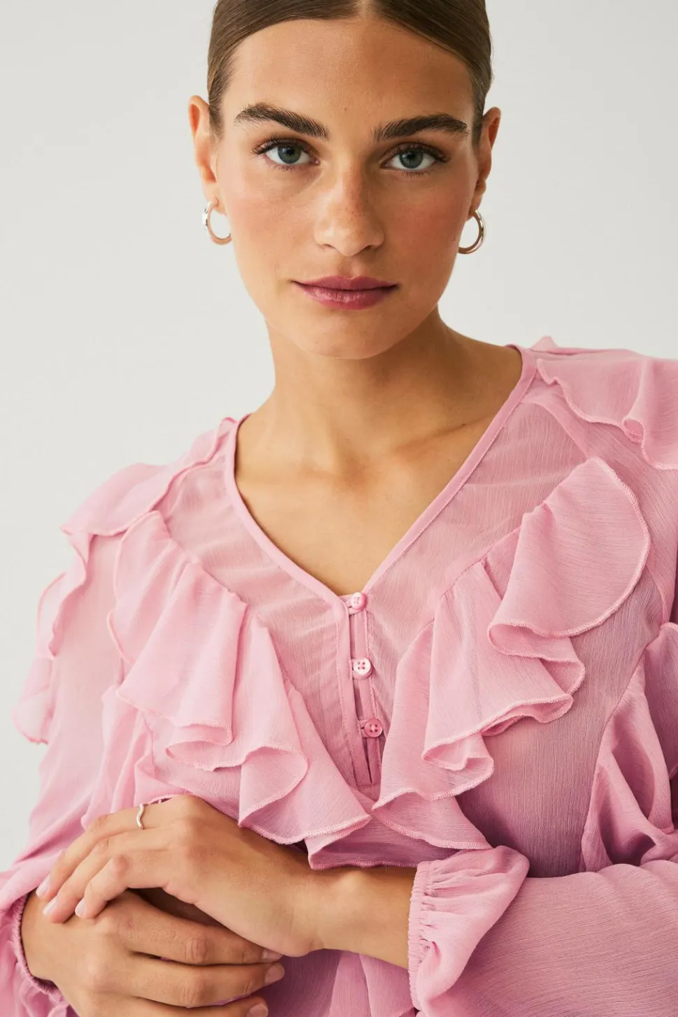 • Transparent bluse i chiffon med volanter hele vejen rundt