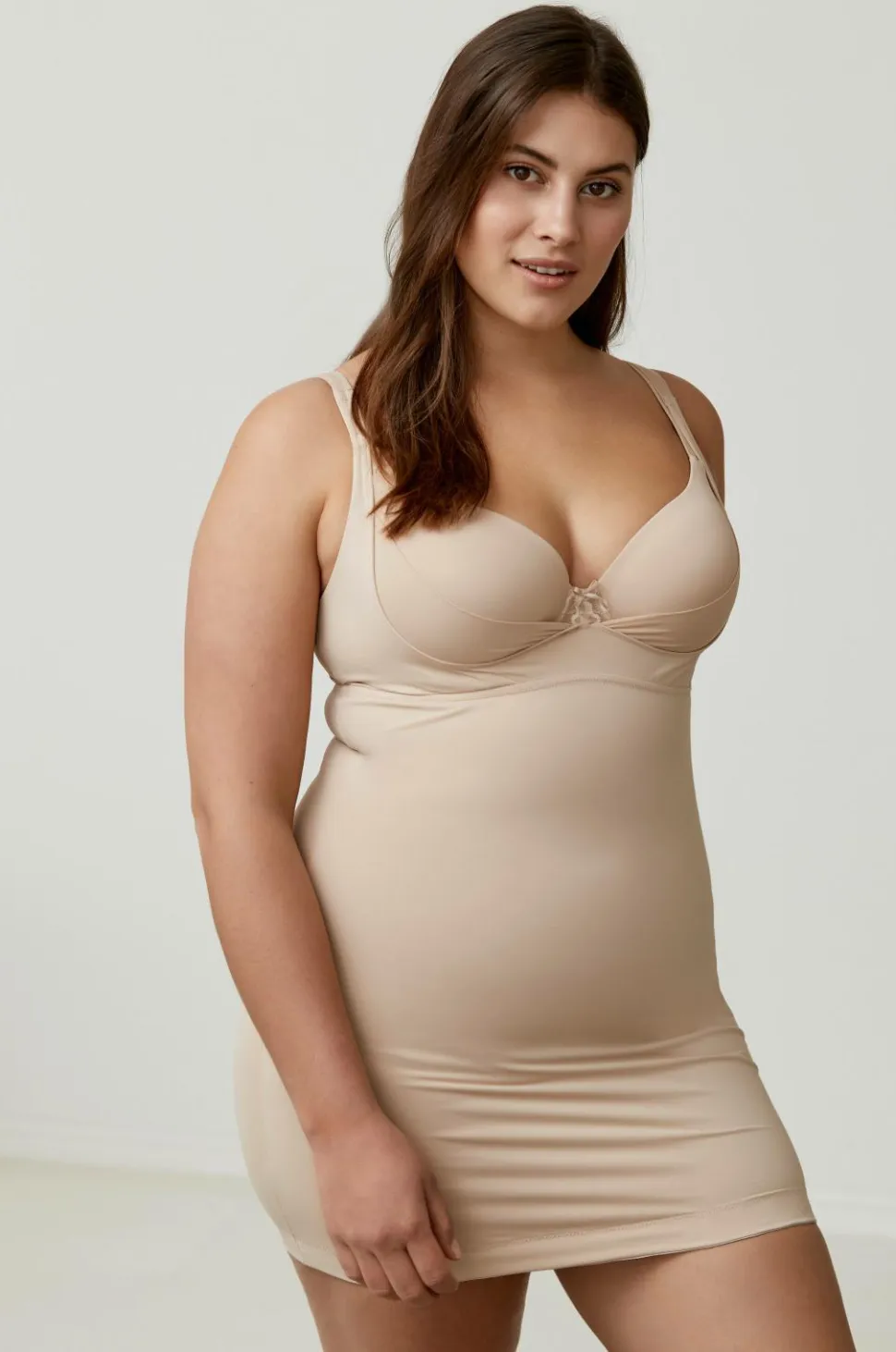 Kjolen har sidestøtte ved barmen, som hjælper din bh med at fremhæve barmen. Silikonekant langs bunden holder kjolen på plads. Konstrueret med minimale sømme for en sømløs, behagelig fornemmelse mod huden. Fremhæver din silhuet uden at gå på kompromis med komforten.