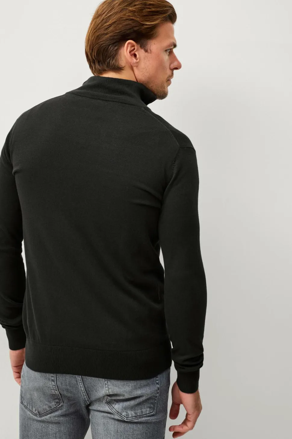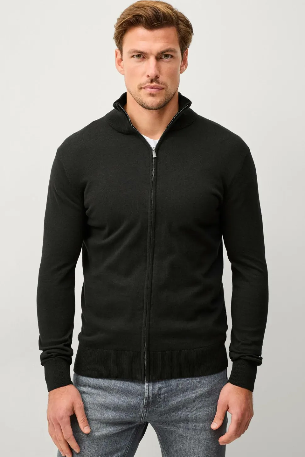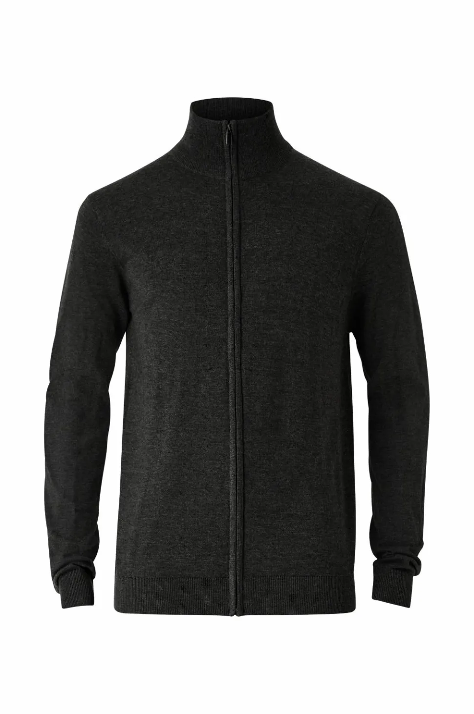 Cardigan Colin fra On Our Terms. Lige model i finstrikket kvalitet med lynlås foran og høj, ribstrikket krave. Ribkant i kanten forneden og ærmekanten. Længde ca. 73 cm i str. M.