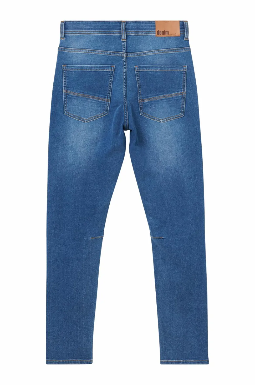 Denimjoggers i blød, skøn stretchkvalitet. 5-lommemodel med lynlåsgylp og justerbar løbegang i taljen. Syede læg ved knæene og let smal pasform.