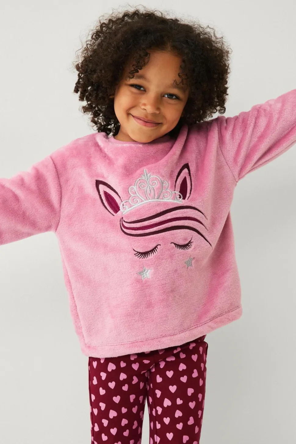 • Blød, luftig fleece med broderi foran