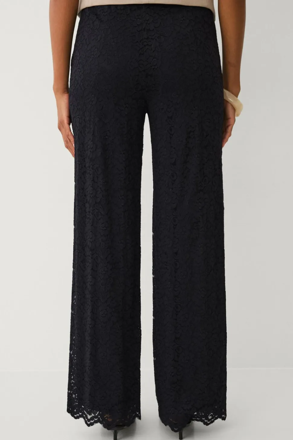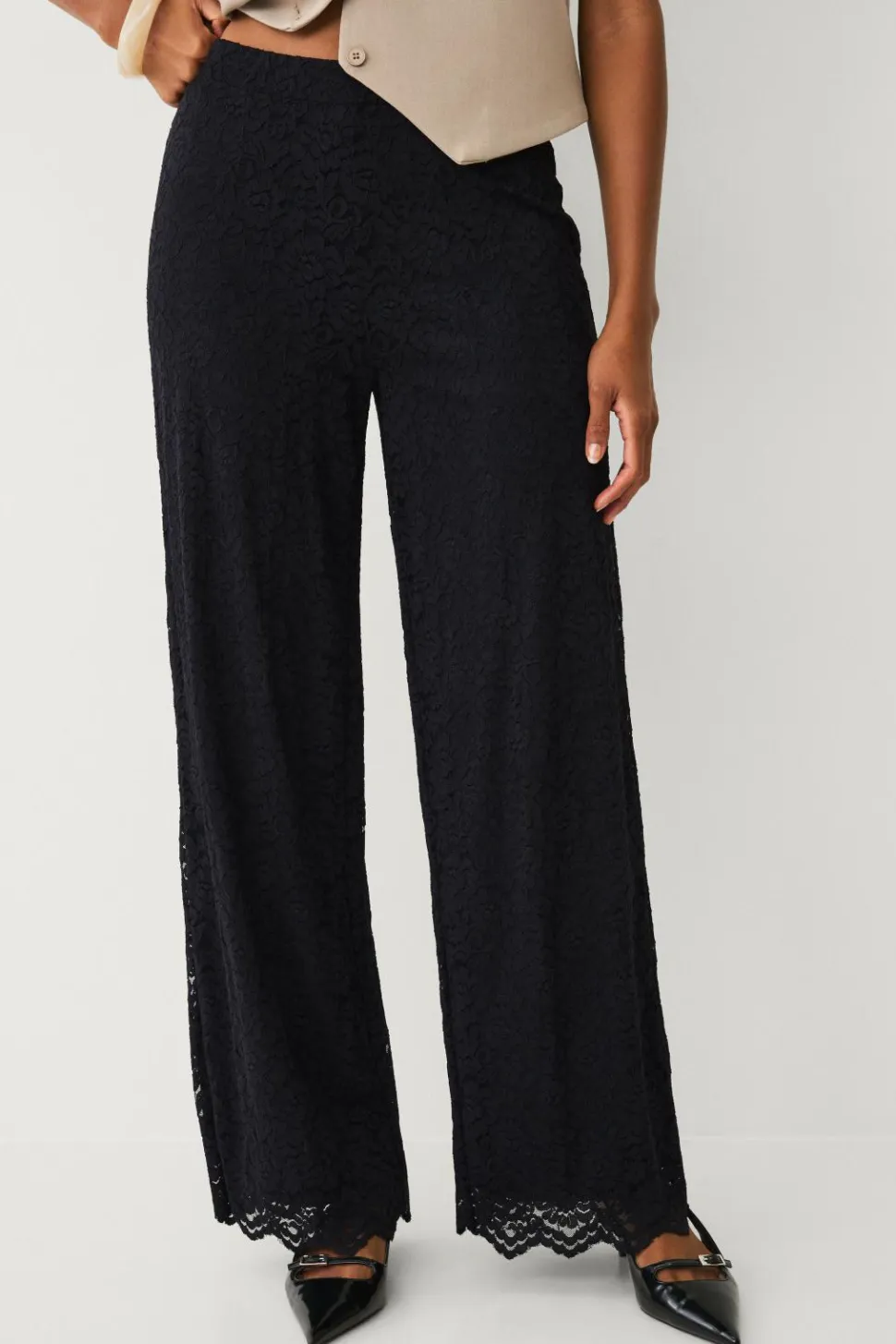 • Brede bukseben med bølget detalje nederst