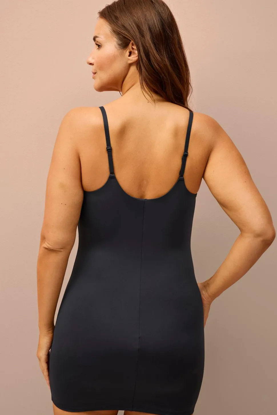 En blød, elastisk shaping-kjole med en formende effekt på taljen, maven og over brystet. Kjolen er konstrueret med et minimalt antal sømme for en sømløs, behagelig fornemmelse mod huden. Fremhæver silhuetten uden at gå på kompromis med komforten.