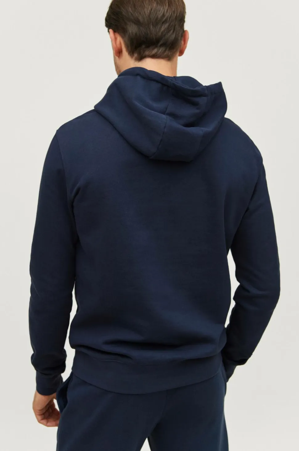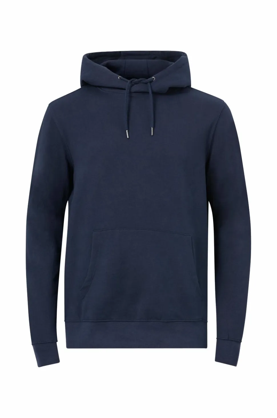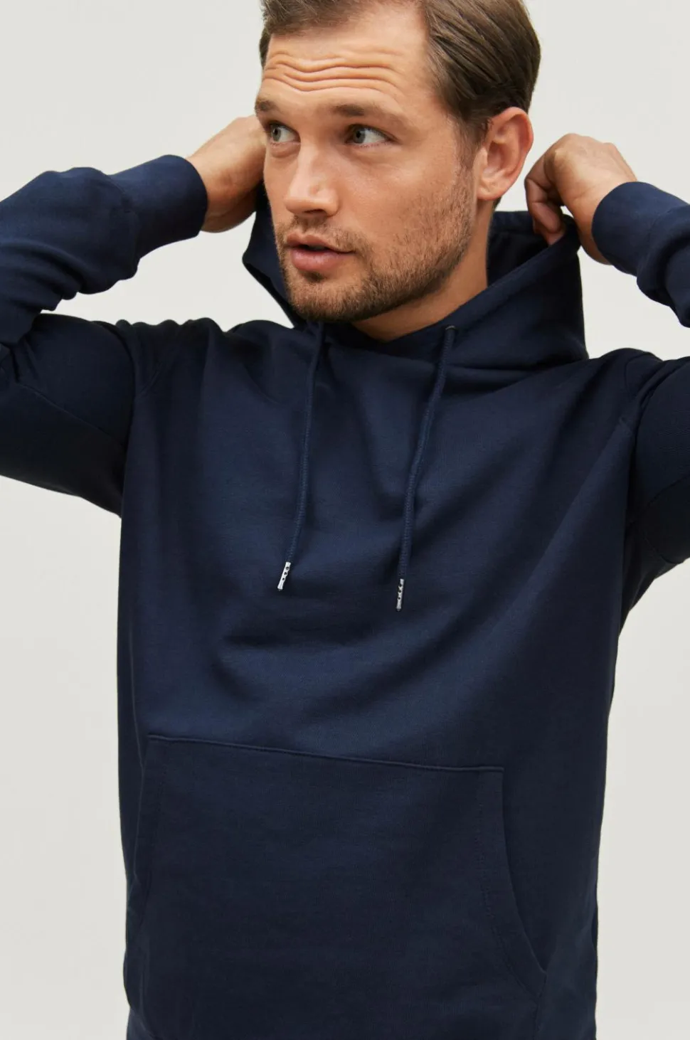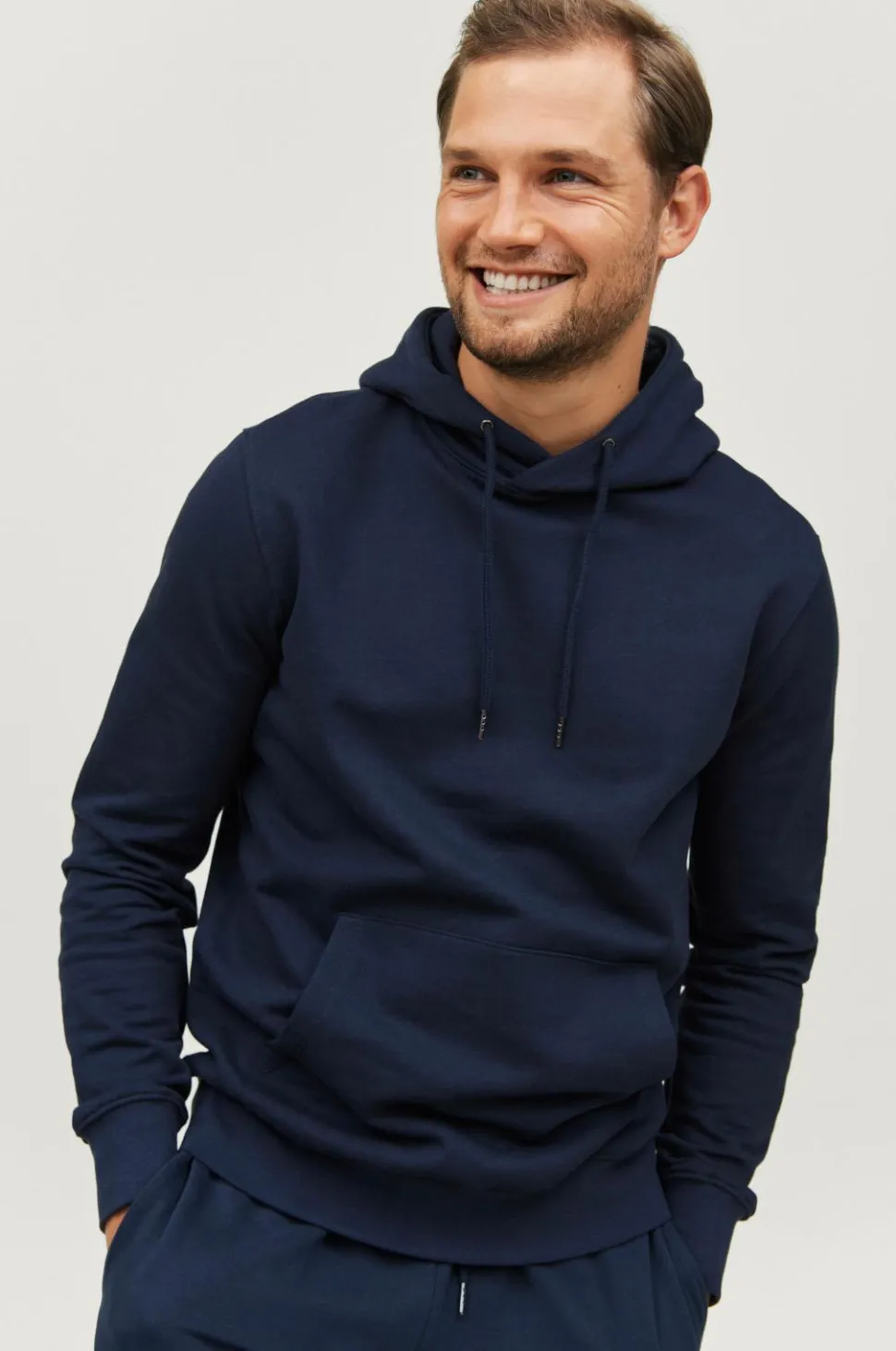 Hættetrøje med blød, børstet inderside. Hætte med løbegang og kængurulomme. Rib i ærmekant og kanten forneden. Længde ca. 73 cm i str. M.