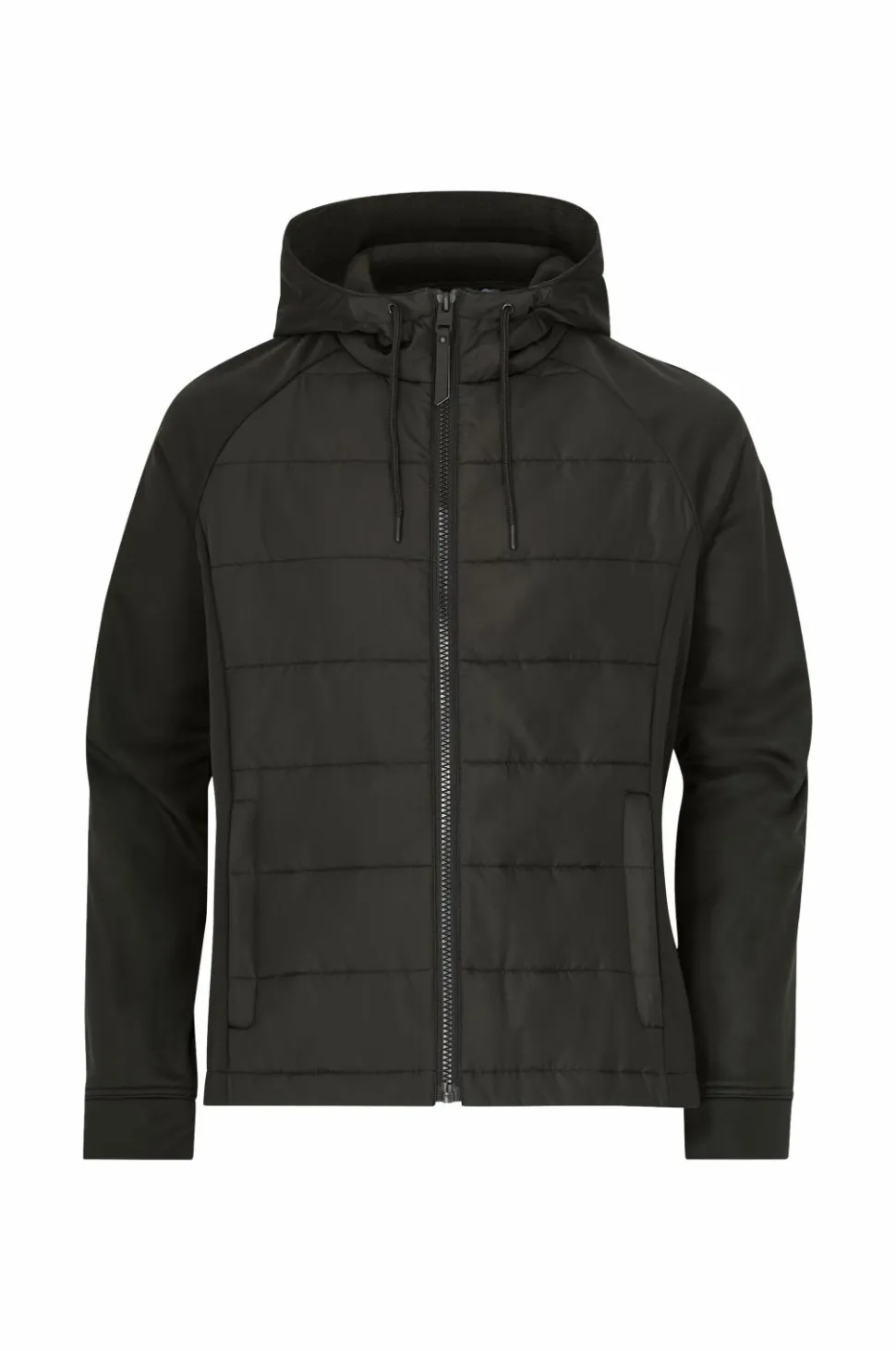 Hybridjakke med ærmer og sider i softshellmateriale med blød, børstet inderside. Quiltet og vatteret stof foran og bagpå samt på hætten. Fast hætte med løbegang. Lukning med lynlås. To lommer med lynlås og to åbne inderlommer. Længde ca. 70 cm i str. M.