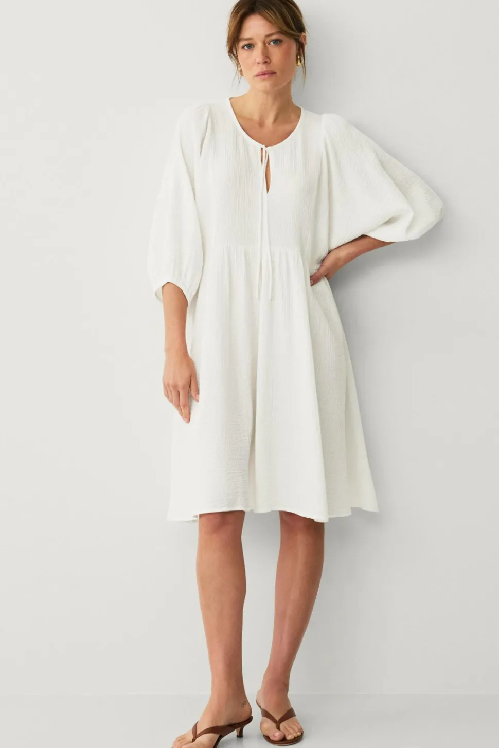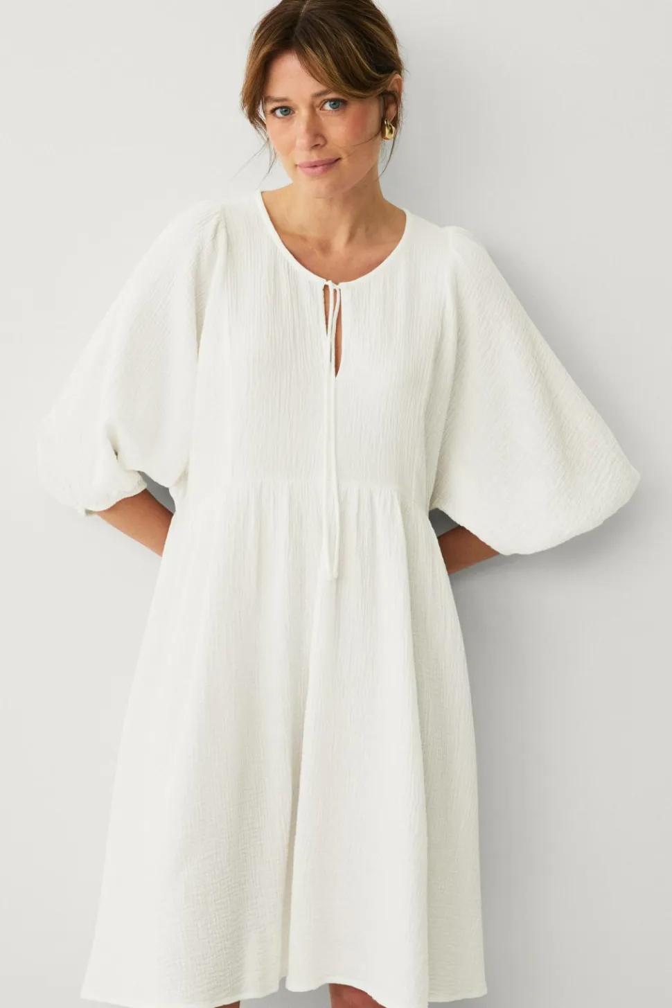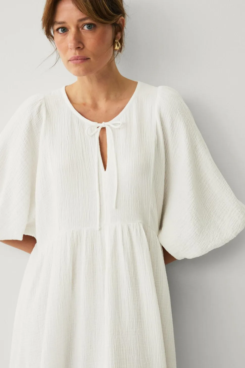 • Rund hals med bindebånd foran