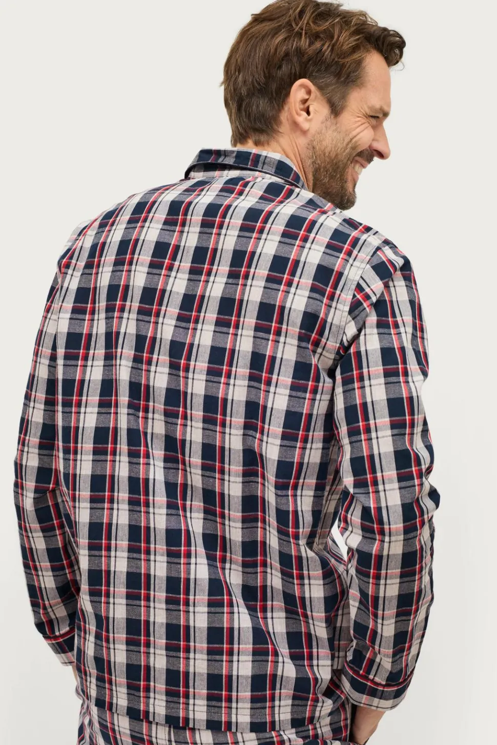 Todelt pyjamas i blød, vævet kvalitet med klassiske tern. Langærmet skjorte med krave og revers, knapper foran og en brystlomme. Bukserne har en elastisk talje med løbegang og lommer i siderne.