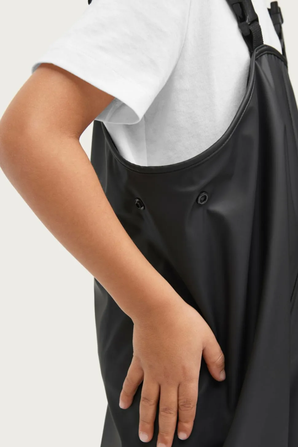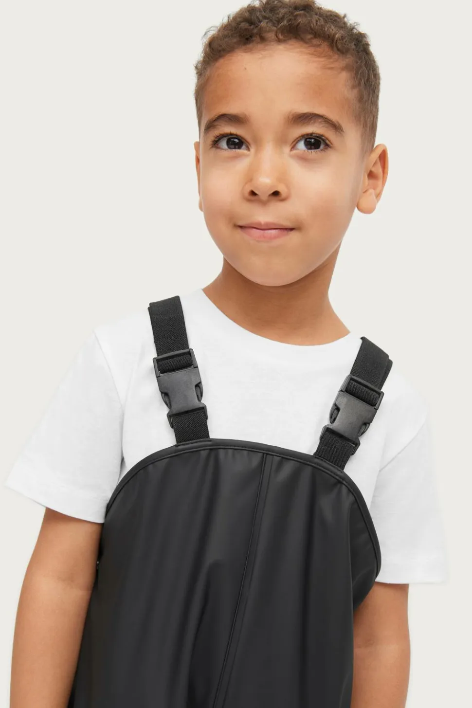 Uforede regnbukser i vandtæt gummikvalitet. Justerbare seler og regulerbar vidde foroven med trykknapper i siderne. Indsat elastik i benkant. Aftagelige, elastiske fodstropper. Striber i refleksprint på benene.