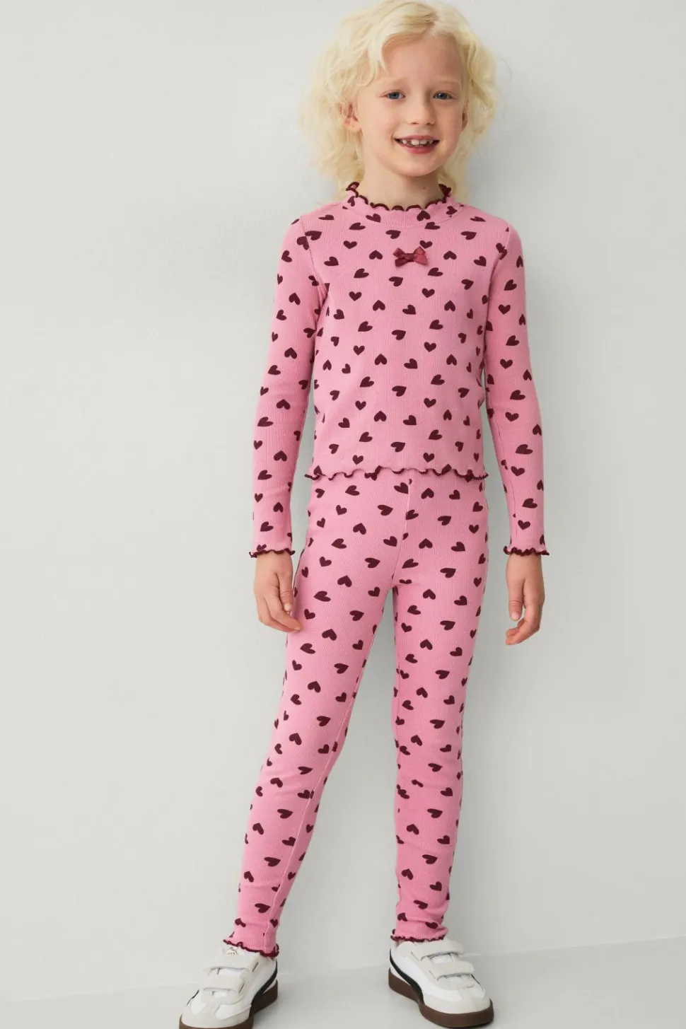 • Ribbede leggings i bomuld med printede hjerter