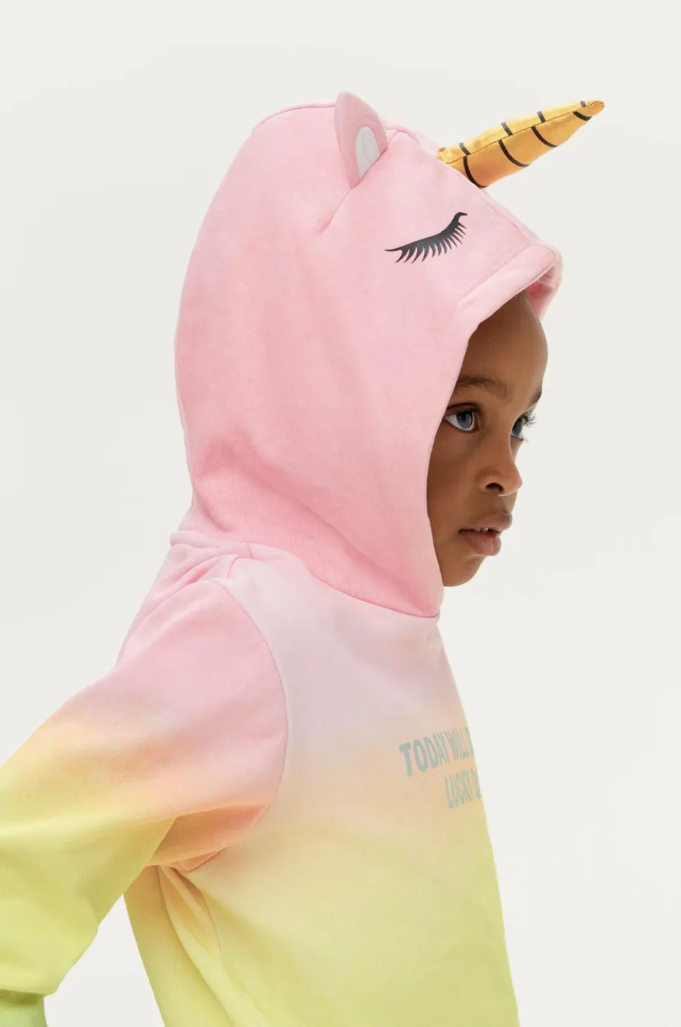 Enhjørningekjole i skønne farver med tekstprint foran og hætte med påsyede ører og horn. Ribkant i ærmekant.