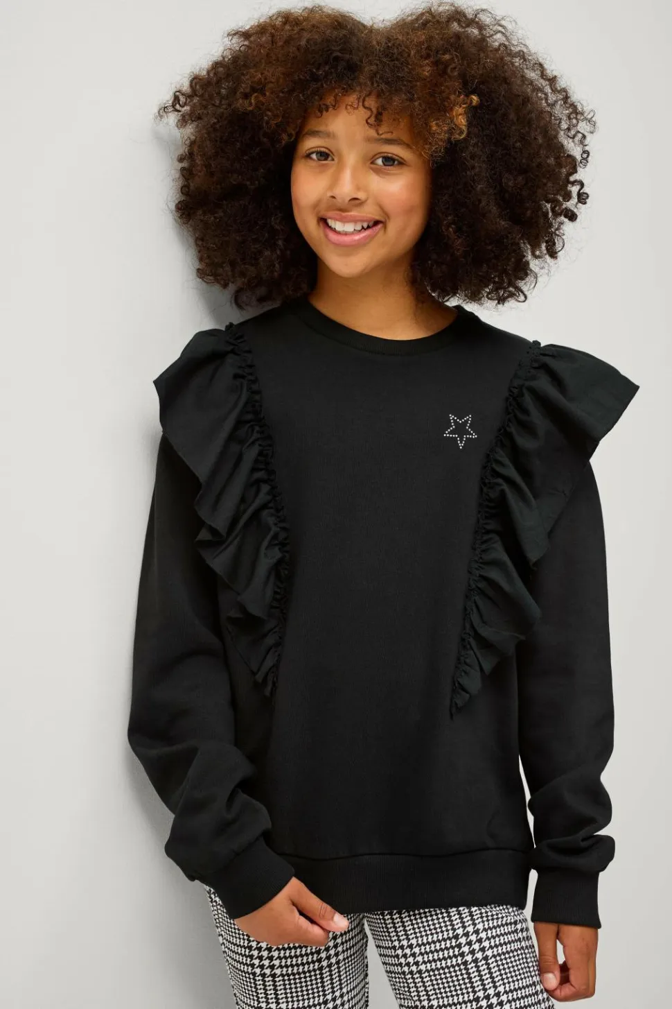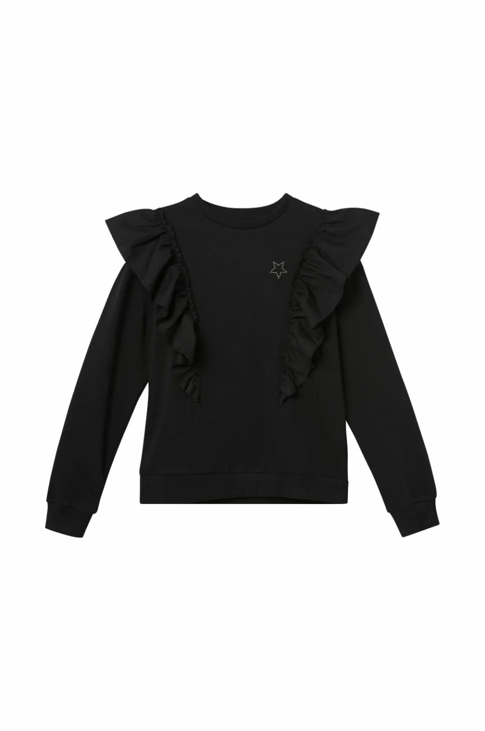 • Vævede, påsyede volanter omkring skuldrene, ved fronten og bagpå