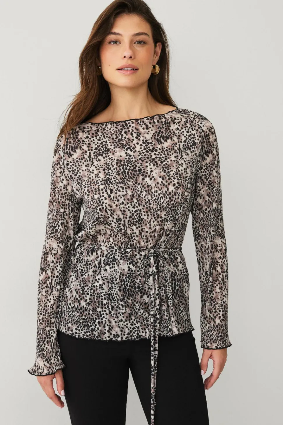 • Langærmet top med plisseret materiale og Bådhals