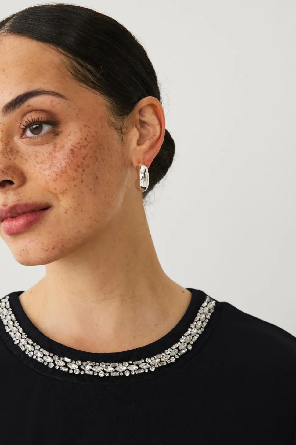 • Rund halsudskæring med mesh og dekorative, funklende sten