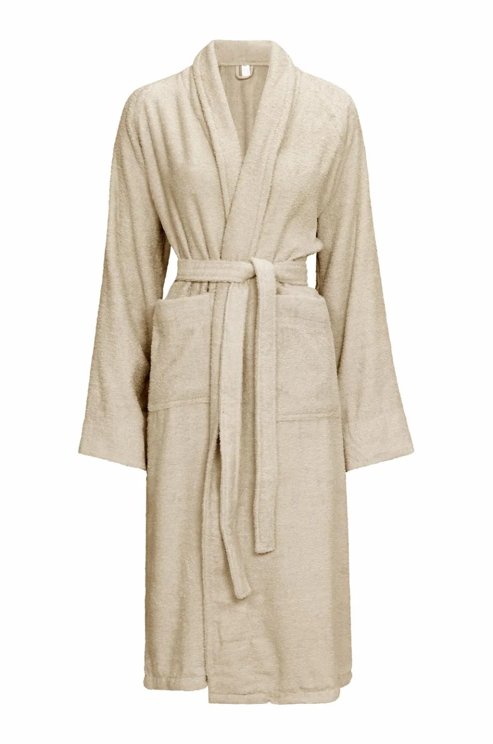 Badekåbe af 100% bomuldsfrotté med krave, to lommer og bindebælte. Længde 120 cm i str. 38/40.