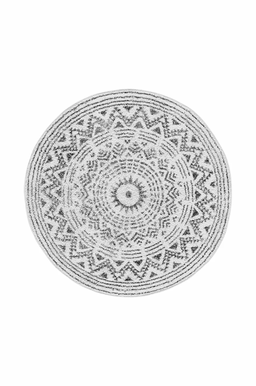 Tuftet, rund badeværelsesmåtte i blød, vamset bomuld med udtryk og look som et ryatæppe. Printet mønster, som varierer i kontrast og tydelighed afhængigt af, hvordan luven i tæppet lægger sig. Ø 80 cm.