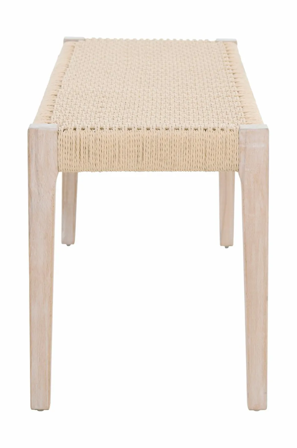 Bænk i lakeret bøgetræ med sæde af flettet jutereb. Farven er vandbaseret.