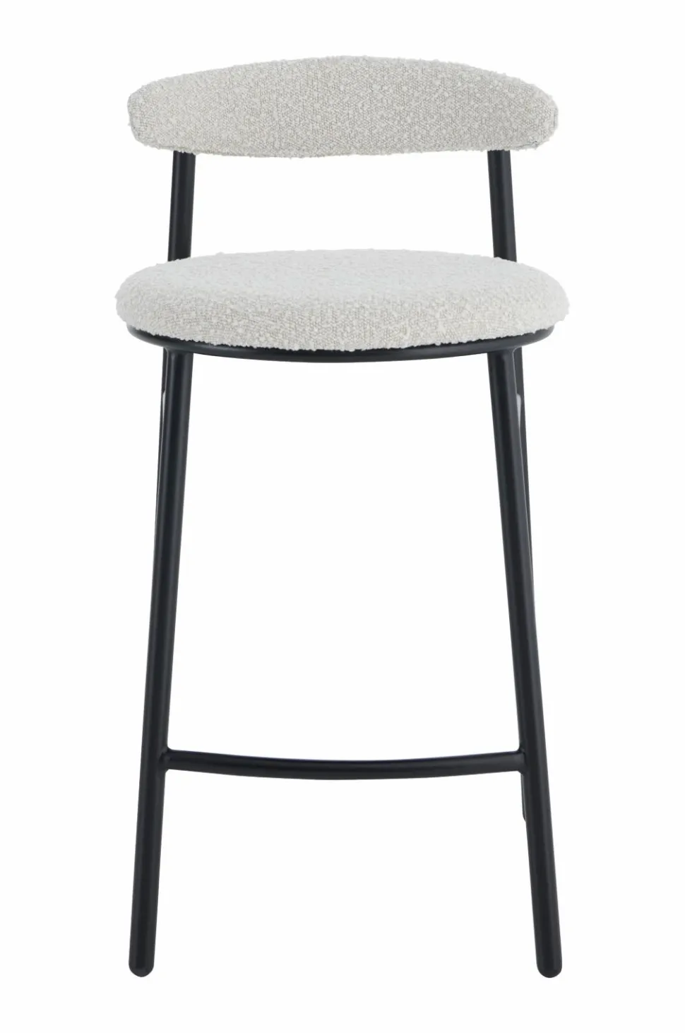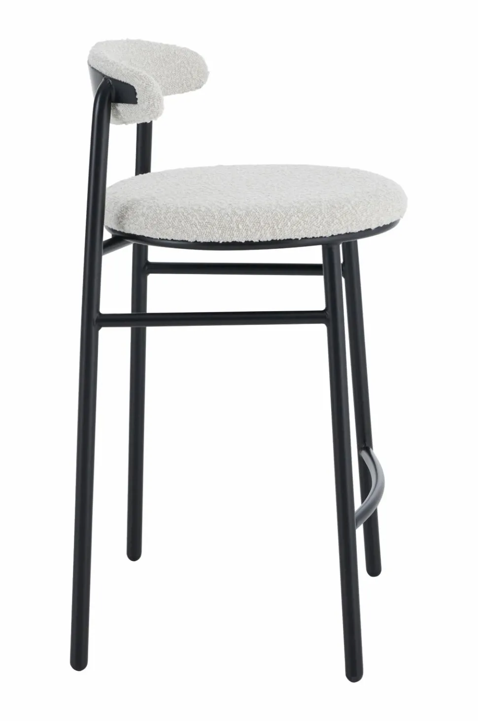 Barstol i moderne design med rundt sæde og svungen ryg. Sæde og ryg med betræk i boucléstof og skumfyld. Stel og ben i pulverlakeret metal. Ryglæn højde 21 cm. Maks. belastning 120 kg.