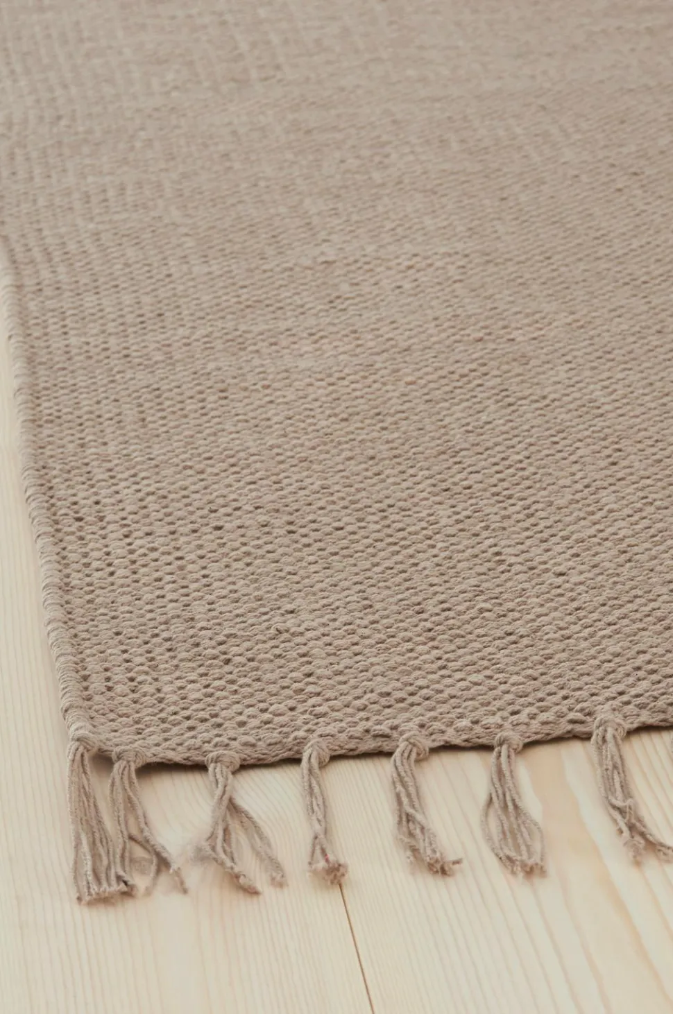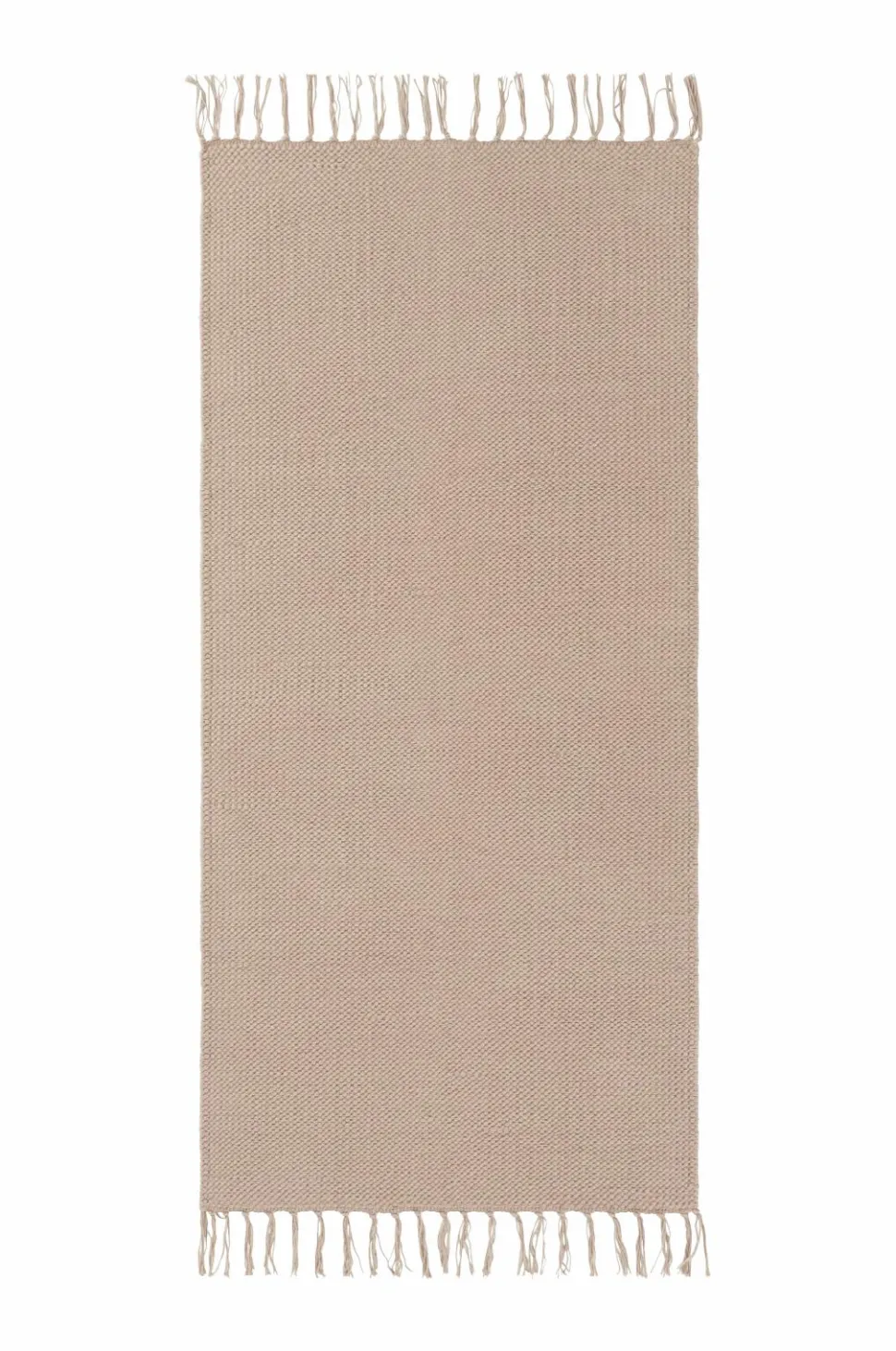 Glatvævet bomuldstæppe med farvede frynser. Højde 0,5 cm.