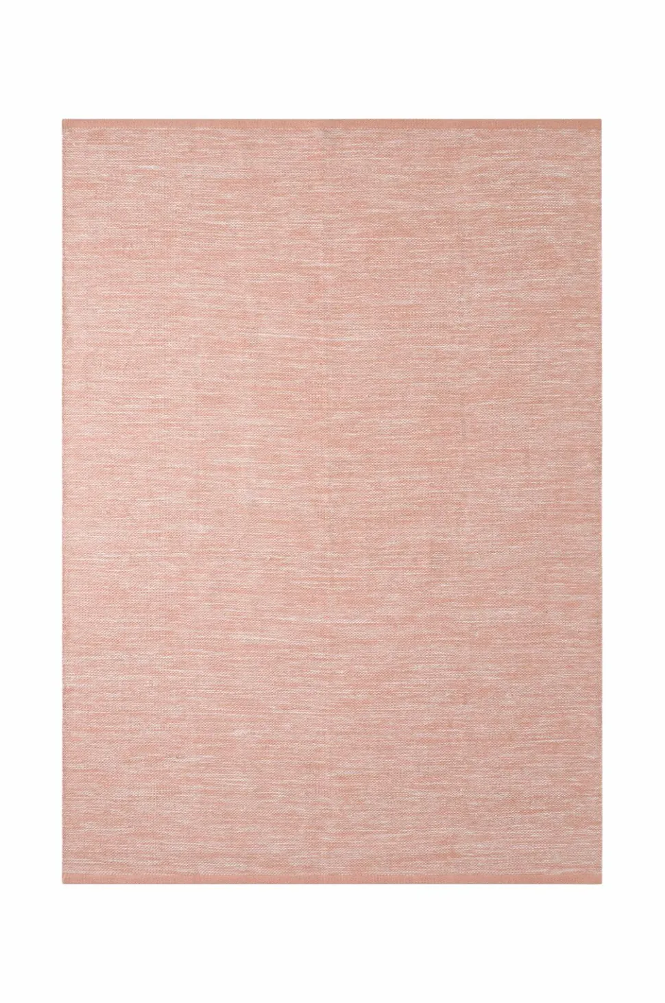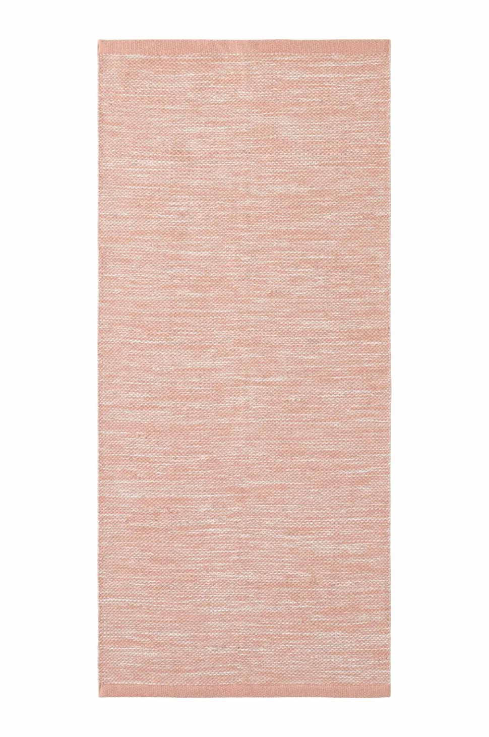 Glatvævet bomuldstæppe i melangefarvet garn med ensfarvede borter i enderne. Højde 0,5 cm.