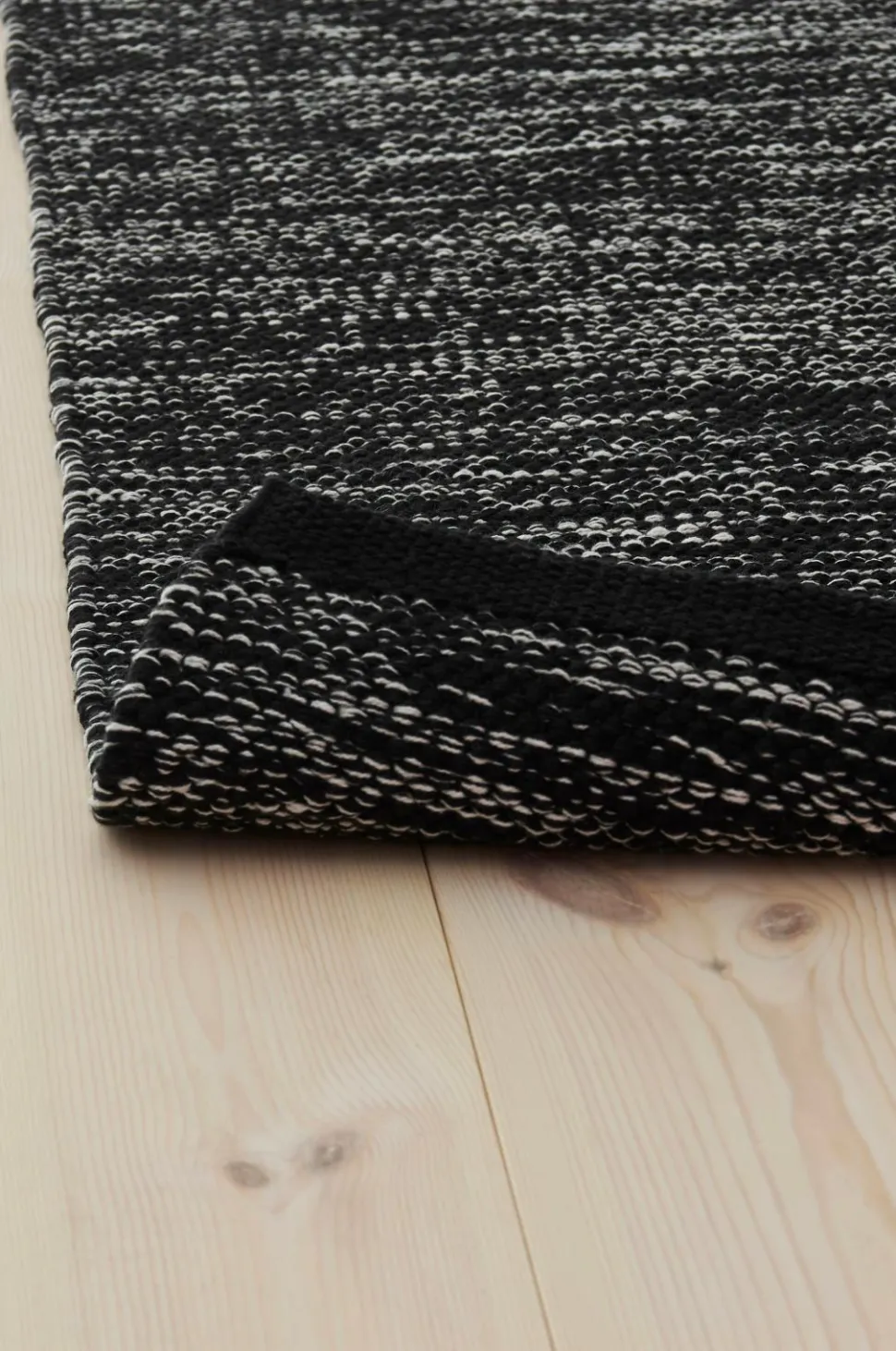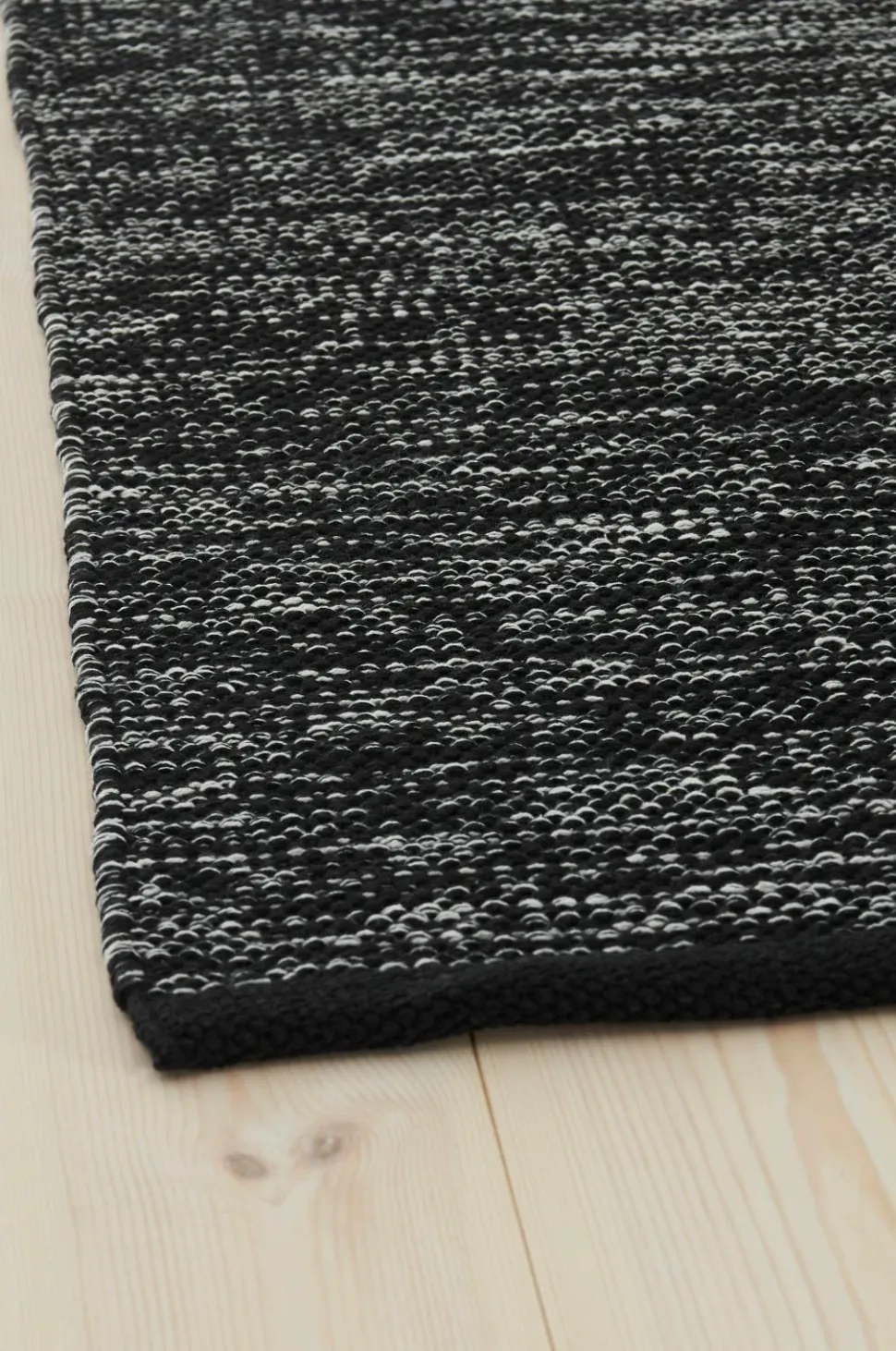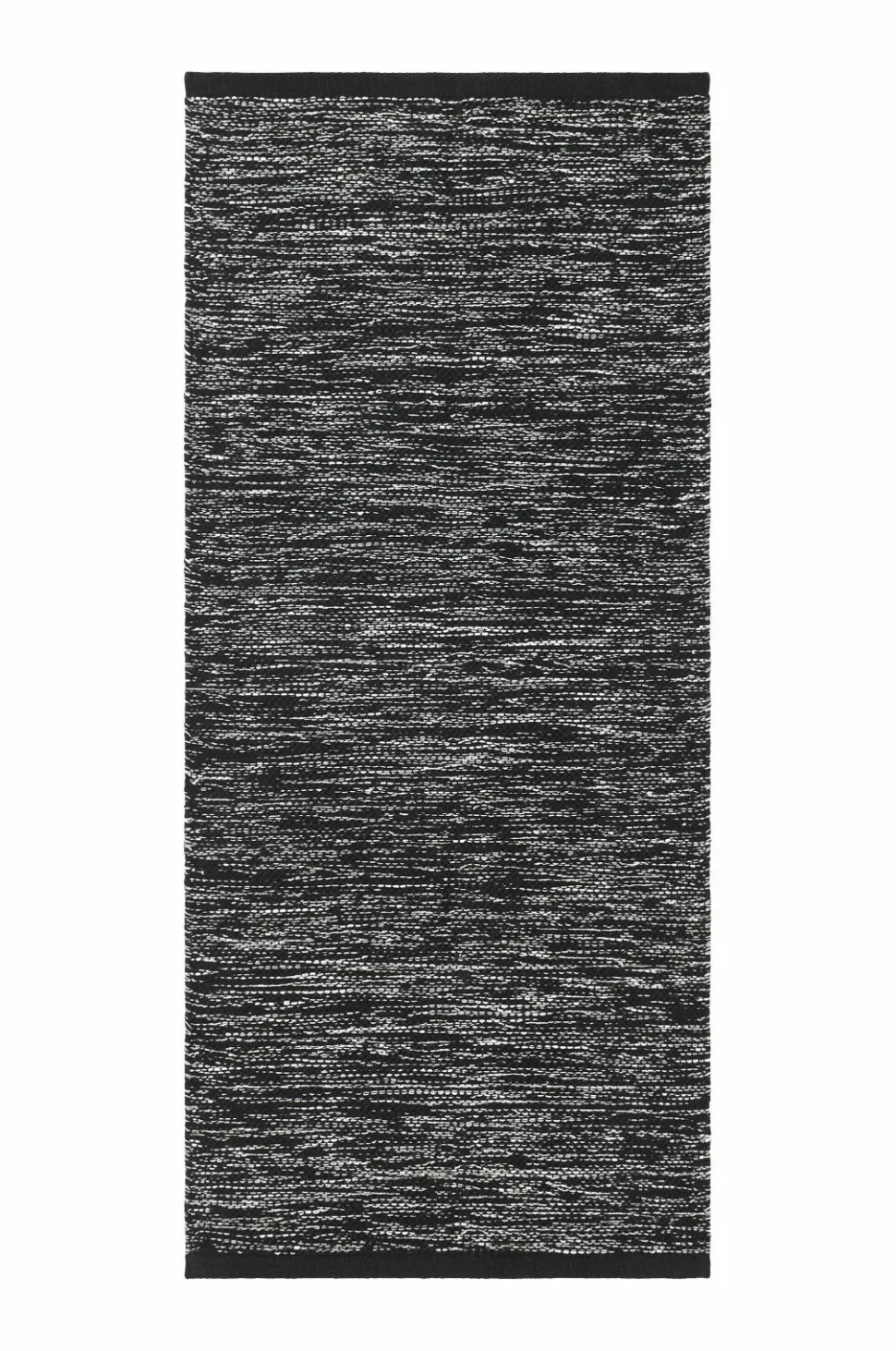 Glatvævet bomuldstæppe i melangefarvet garn med ensfarvede borter i enderne. Højde 0,5 cm.