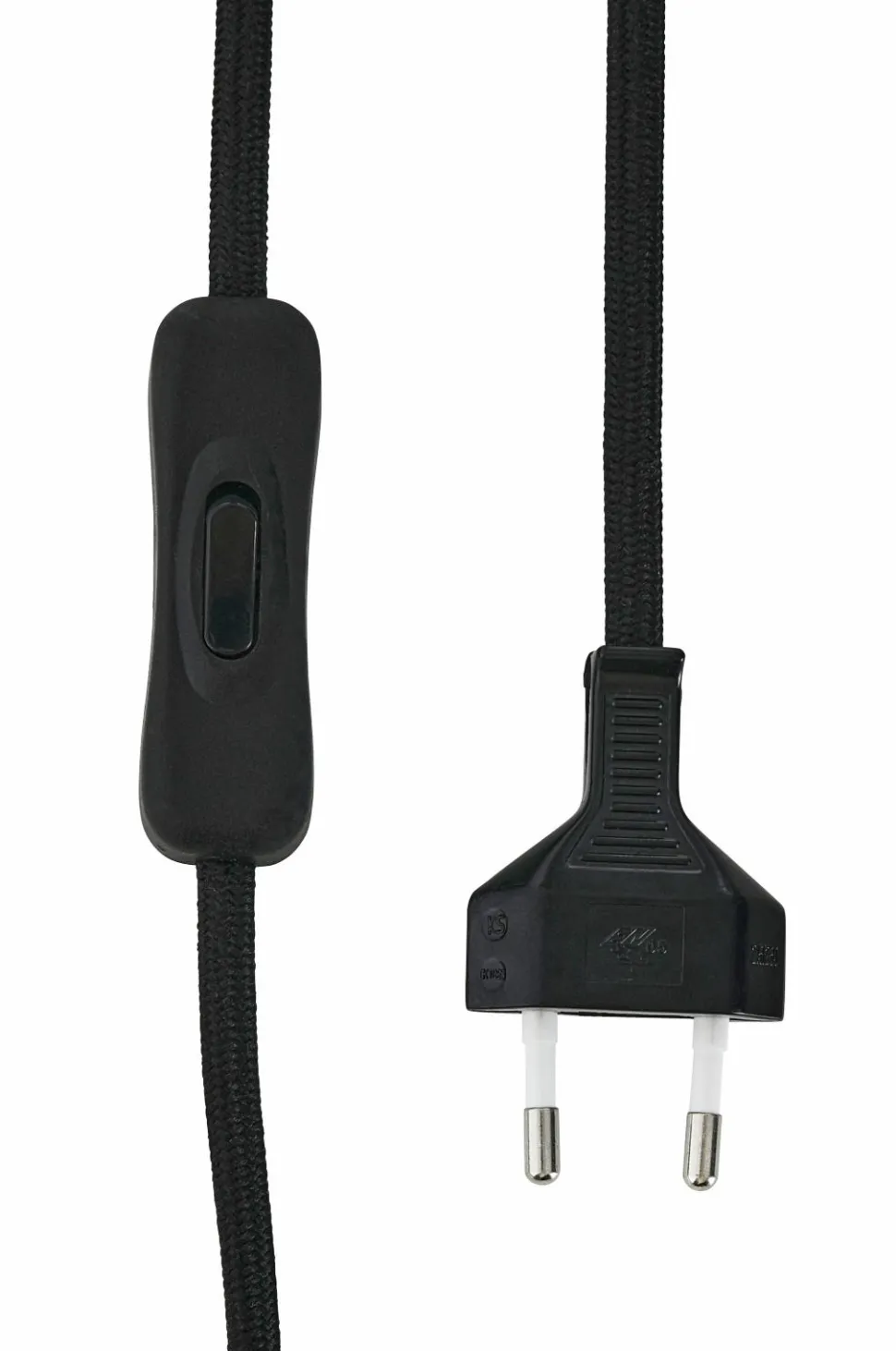 Bordlampe med skærm af hørstof. Af keramik med rillet struktur. Sort stofledning med strømafbryder.