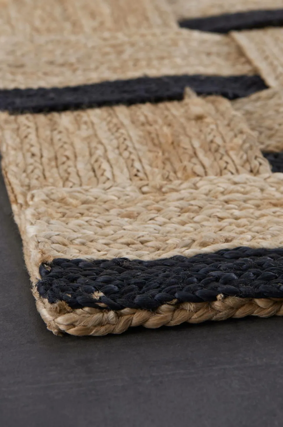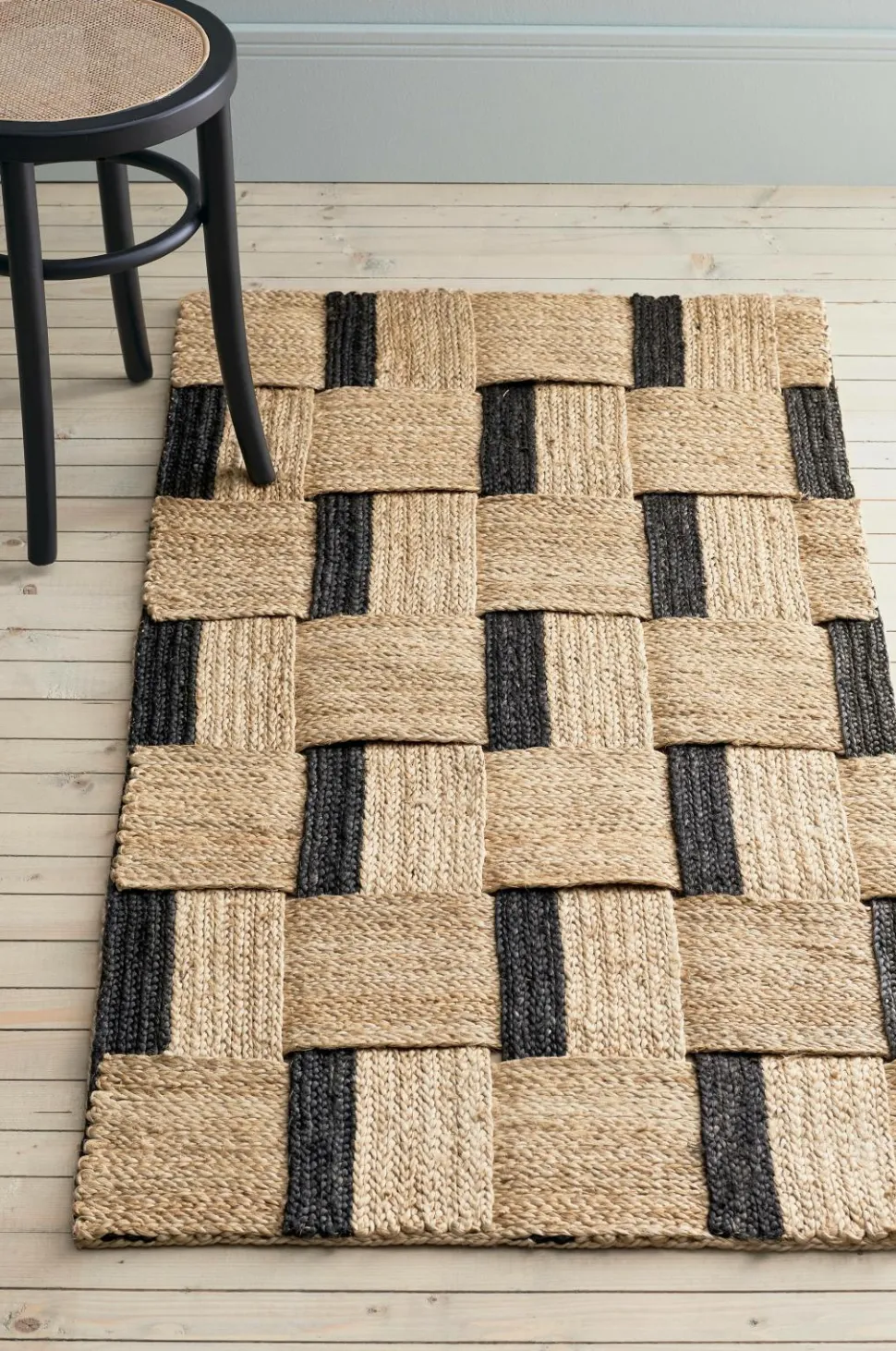 Dørmåtte af flettet, grov jute som er lagt i mønster.