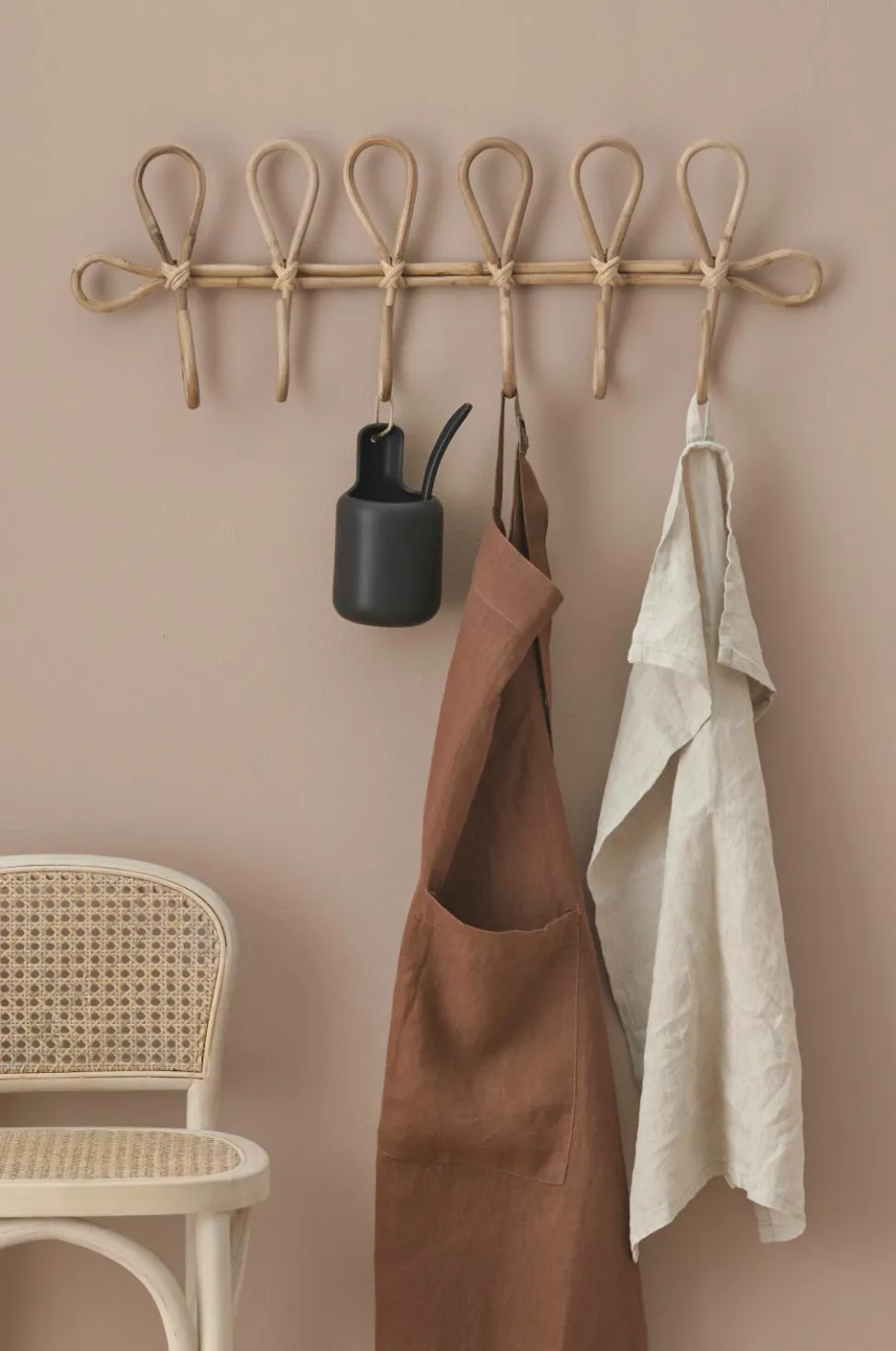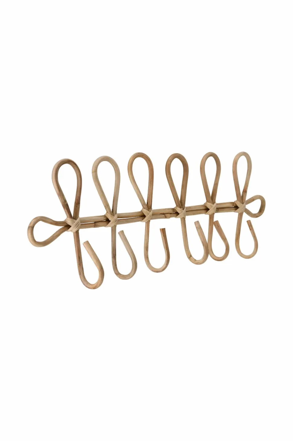 Knagerække af rotting med 6 kroge. Bredde 71 cm, højde 24,75 cm, dybde 8,25 cm. Hænges op med skrue eller vægkroge (medfølger ikke). Produktet er håndlavet, hvilket at der kan forekomme små forskelle i målene.