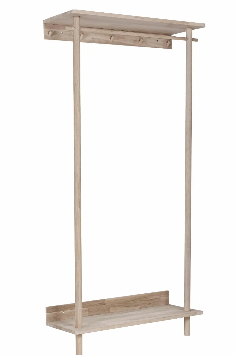 Entremøbel med skohylde, hattehylde og 5 kroge. Af olieret eg. Højde 170 cm, dybde 34 cm, bredde 80 cm. Højde fra gulvet til første hylde 13 cm. Leveres usamlet.