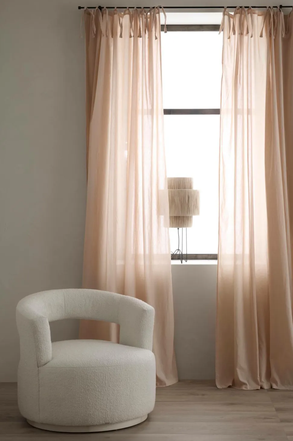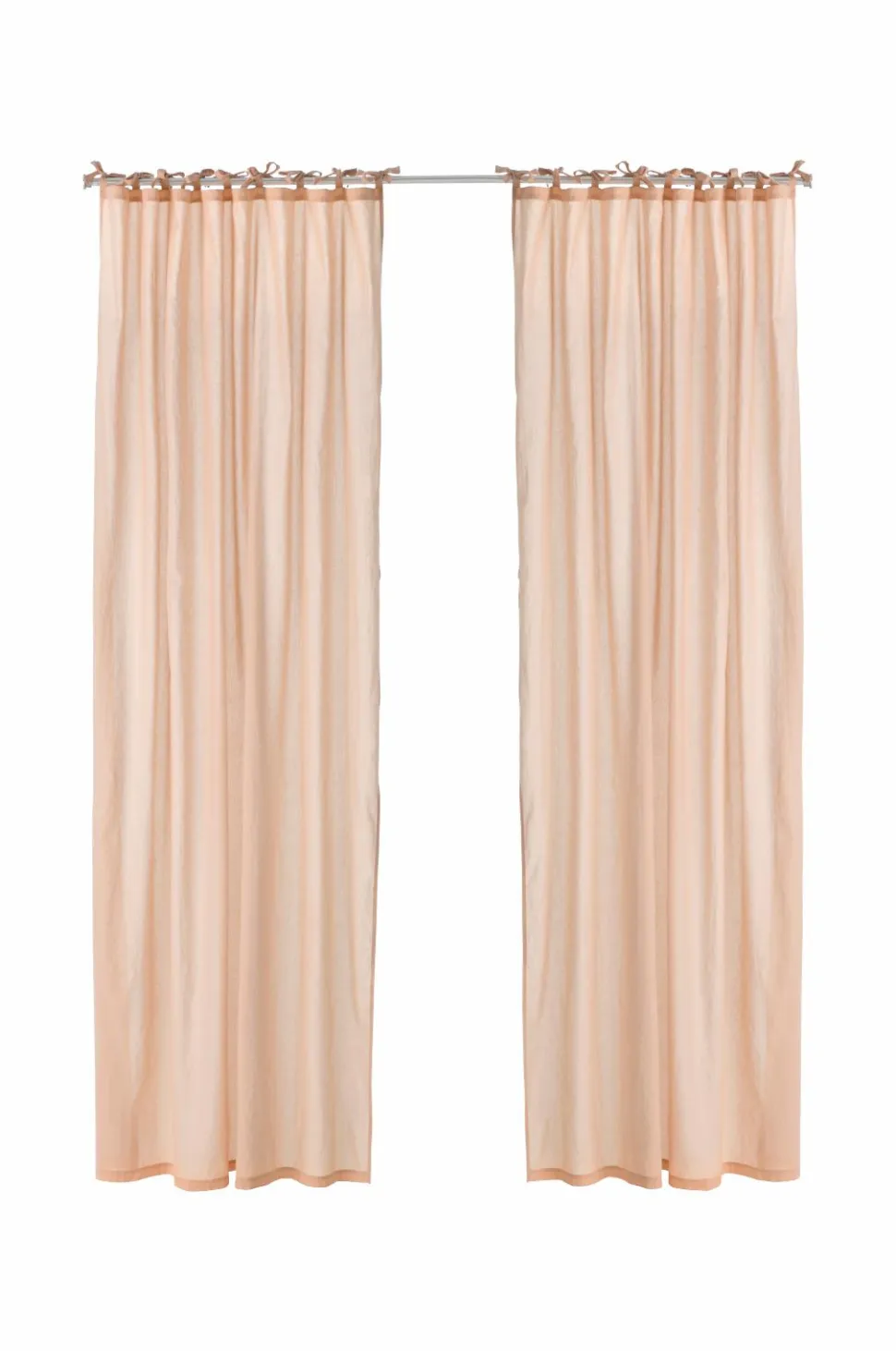 To gardinlængder med bindebånd i blød, vasket bomuldsvoile. Gardinlængder med bindebånd giver et romantisk udtryk, med bånd foroven som bindes rundt om gardinstangen. Du vælger selv om båndet skal hænge, eller om du vil binde sløjfer. Bredde 145 cm. Gardinerne findes i to længder: 220 og 250 cm.