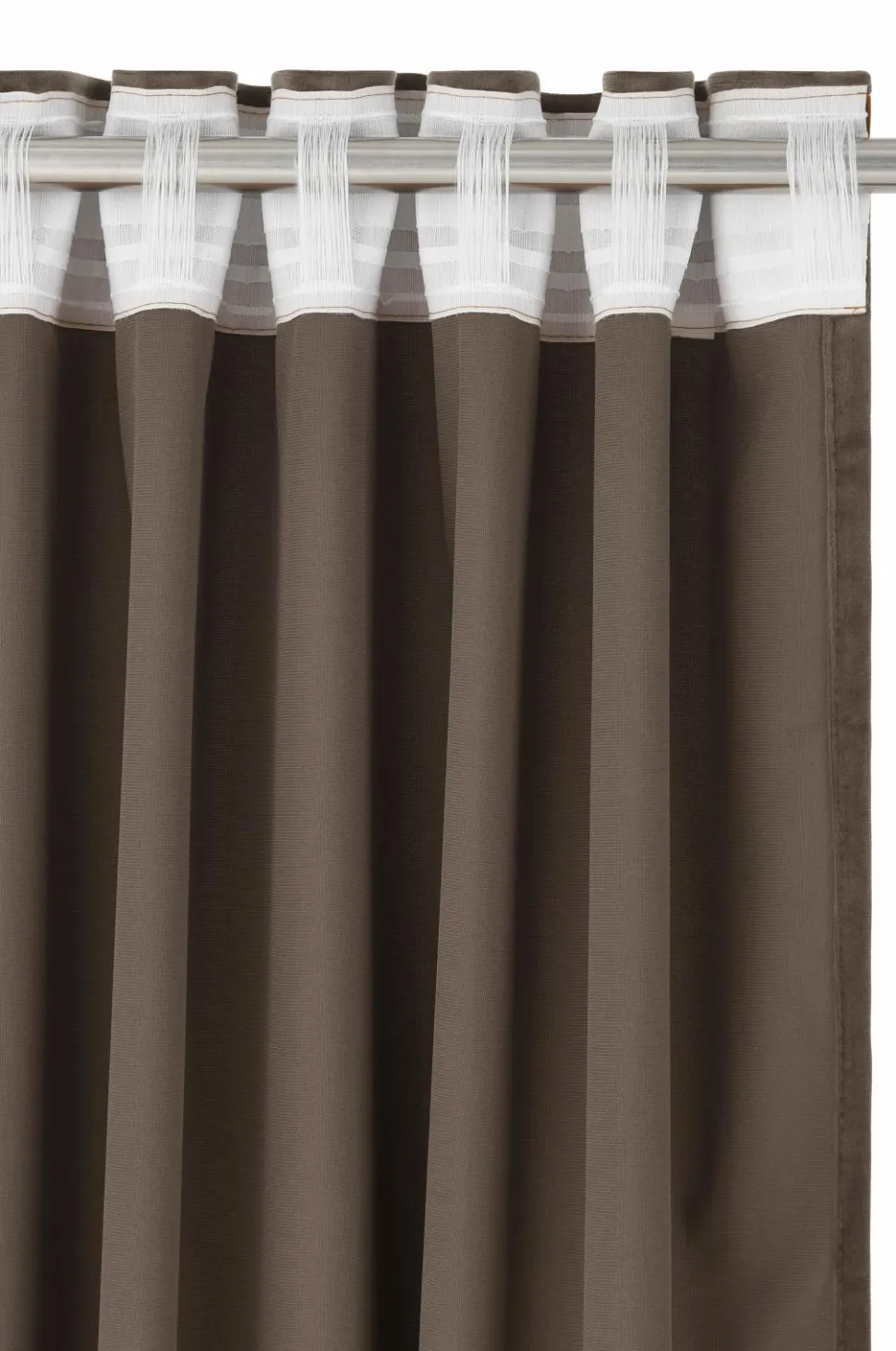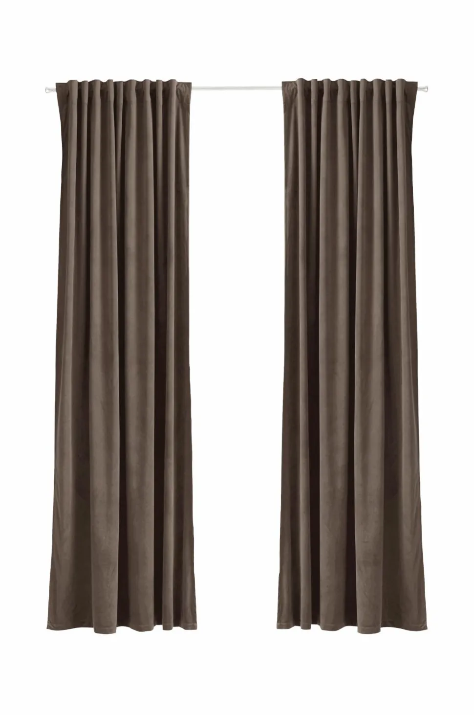 To multibåndslængder i velour med fin glans og blødt fald. Multibåndet gør, at du enten kan hænge gardinerne direkte på en gardinstang gennem de skjulte stropper eller anvende ringe, nålekroge eller fingerkroge. Snore i rynkebåndet gør at du let kan skabe ensartede, flotte læg. Bredde 140 cm. Tre længder: 220, 250 og 300 cm.
