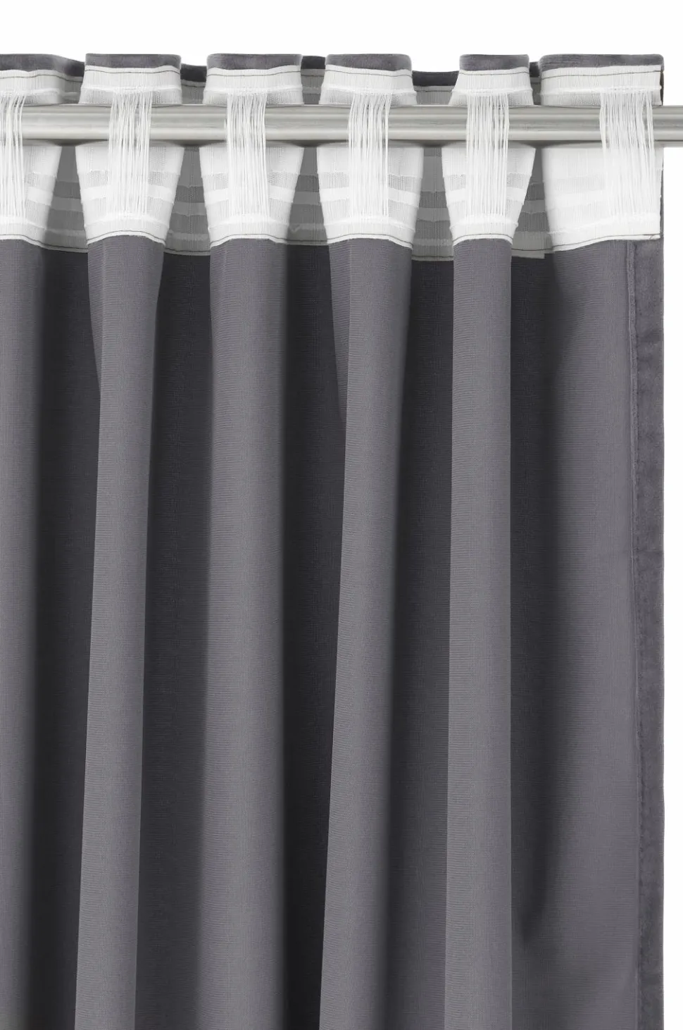 To multibåndslængder i velour med fin glans og blødt fald. Multibåndet gør, at du enten kan hænge gardinerne direkte på en gardinstang gennem de skjulte stropper eller anvende ringe, nålekroge eller fingerkroge. Snore i rynkebåndet gør at du let kan skabe ensartede, flotte læg. Bredde 140 cm. Tre længder: 220, 250 og 300 cm.